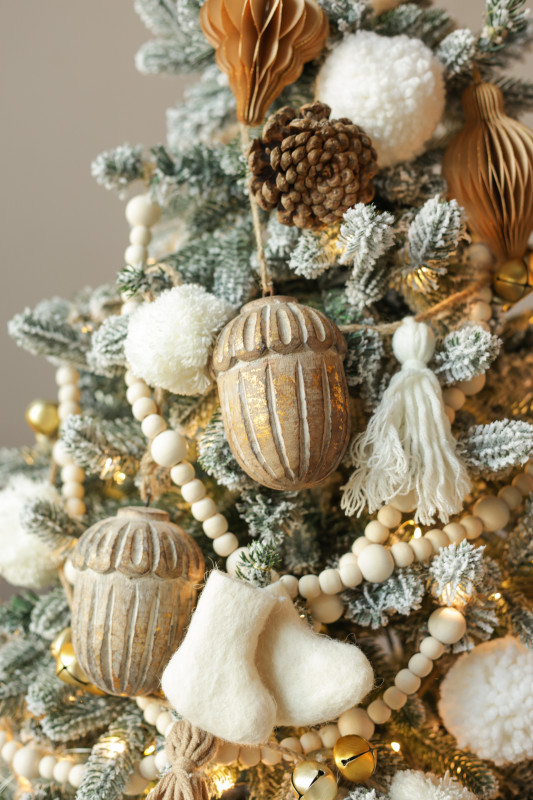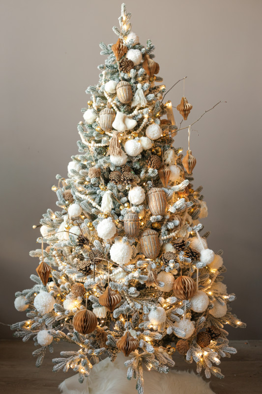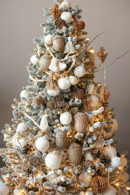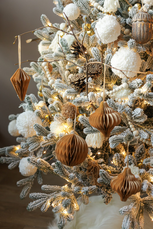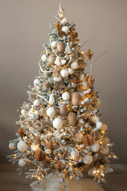 Пушистая заснеженная елочка ручной работы 180 см с авторским бело-золотым декором. Бусы, пушистые снежки, шишки, бумажные ячеистые игрушки и деревянные желуди создают уютную зимнюю атмосферу, а диодная гирлянда «Роса» равномерно освещает всю композицию, подчёркивая её праздничный блеск.