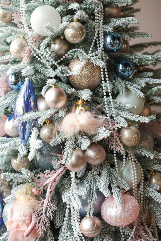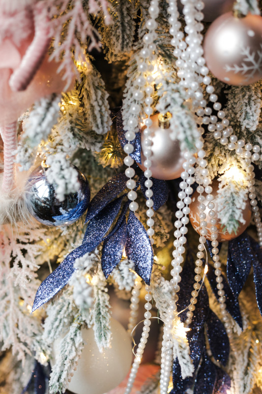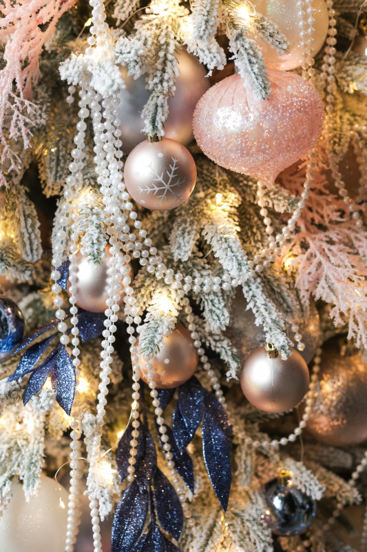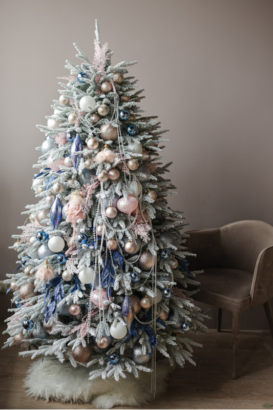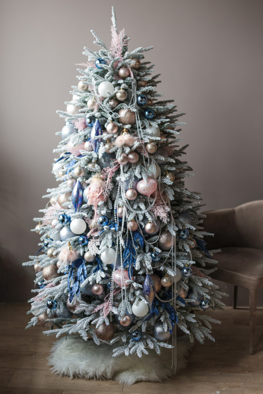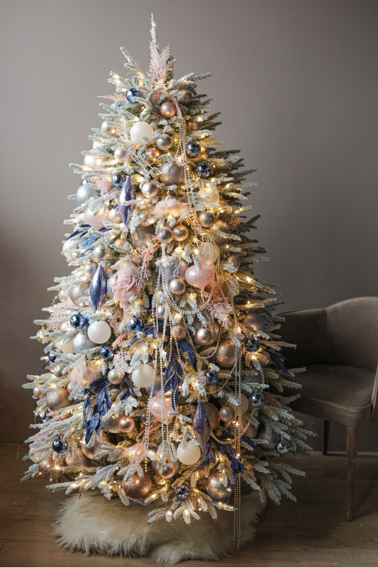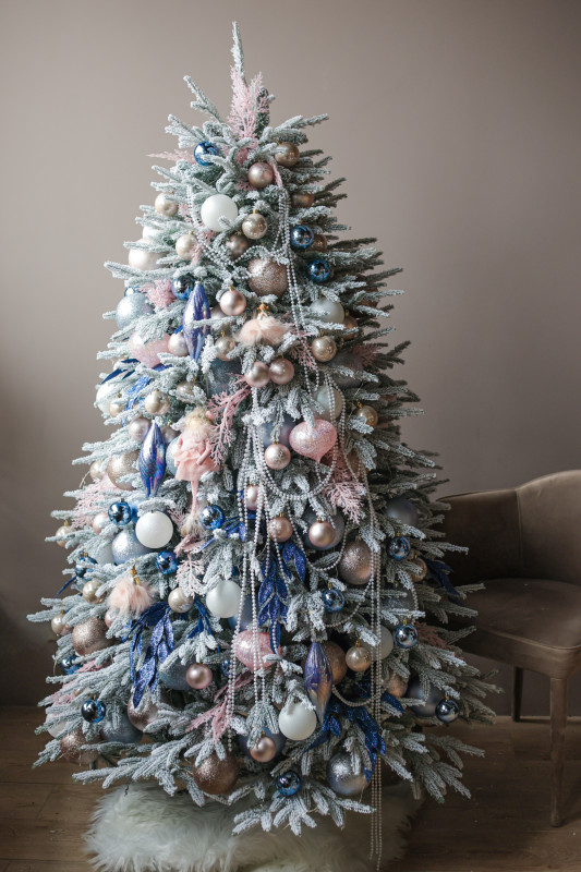 Шикарная заснеженная искусственная ель 1,8 м с розово-голубым декором создаёт атмосферу нежности, сияния и зимнего волшебства. Акцентные блестящие синие игрушки добавляют глубину и праздничный контраст, декоративные листья усиливают текстурность и объём, а жемчужные бусы и мягкое мерцание диодной гирлянды подчёркивают утончённость всей композиции. Такая ёлка станет выразительным центром интерьера — ярким, стильным и по-настоящему праздничным.