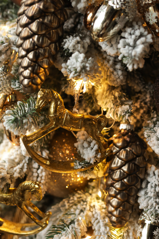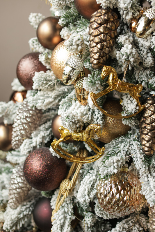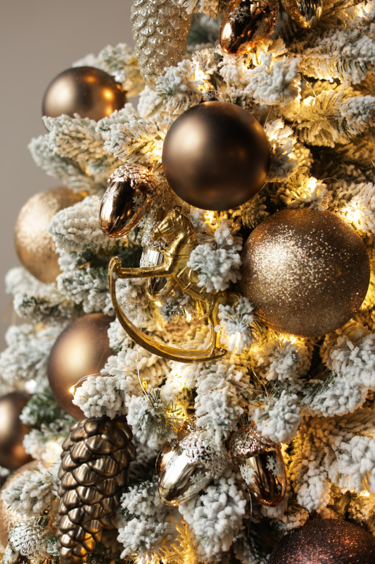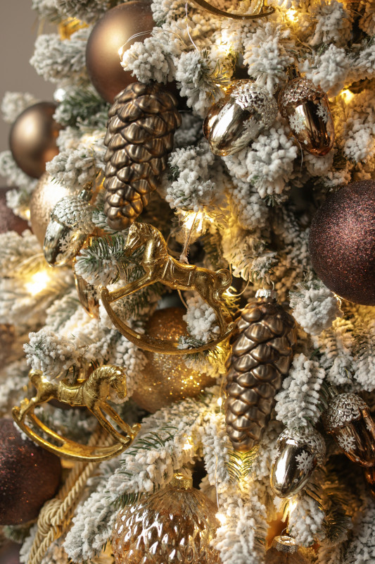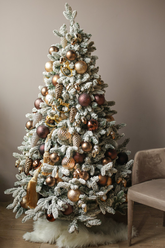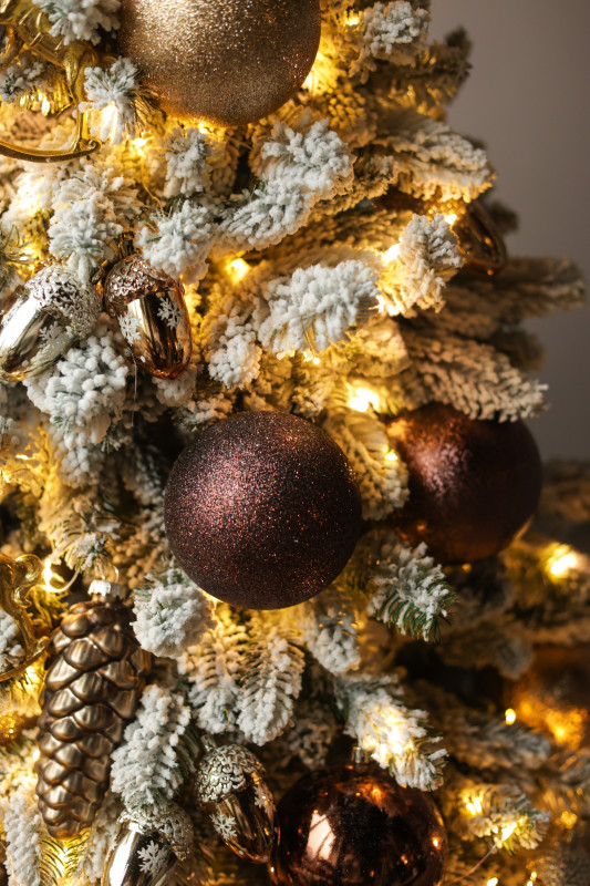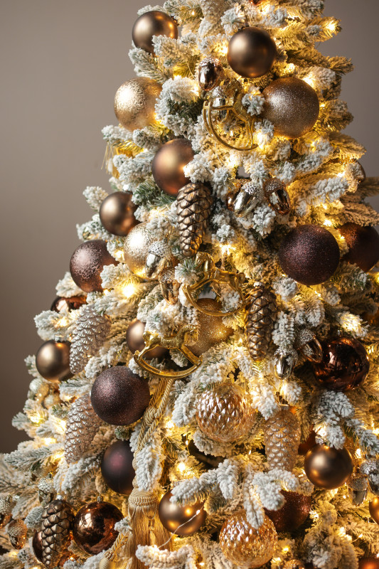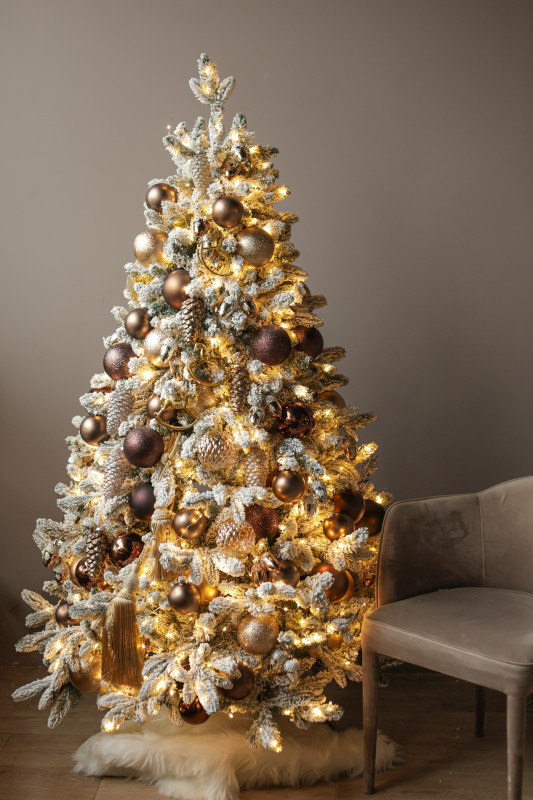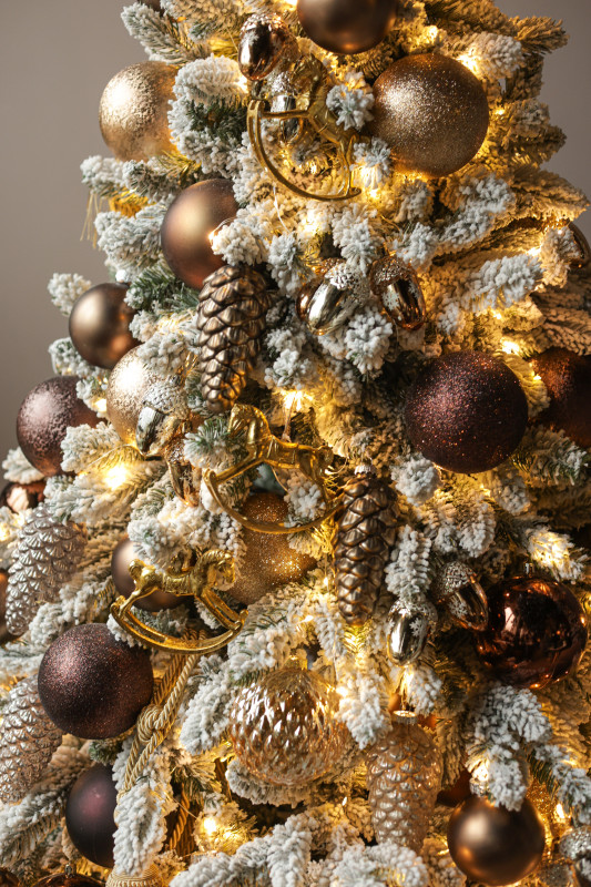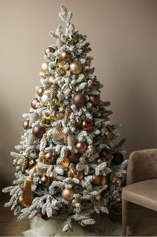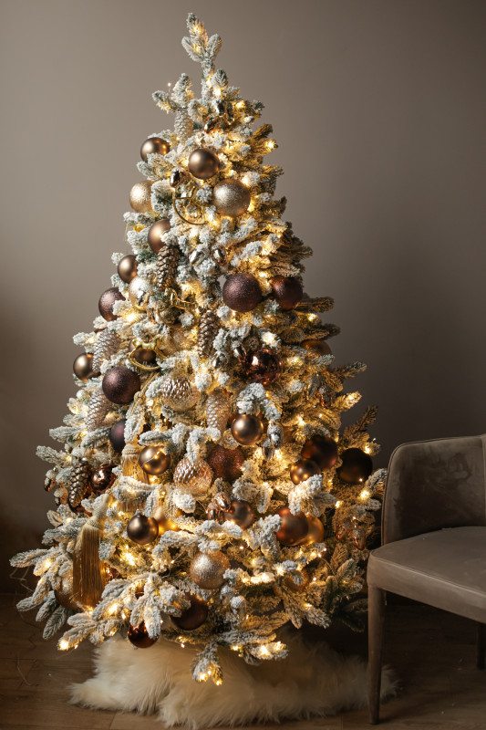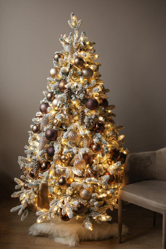 Заснеженная искусственная ель из пушистой хвои 1.8 м с шоколадно-золотым декором создаёт тёплую, глубокую и благородную атмосферу зимнего праздника. Акцентные золотые кисти добавляют изысканности и лёгкого восточного шарма, а декоративные шишки подчёркивают природность и уют композиции. Такая ёлка станет стильным центром интерьера, идеально сочетаясь как с классическим, так и с современным оформлением дома.