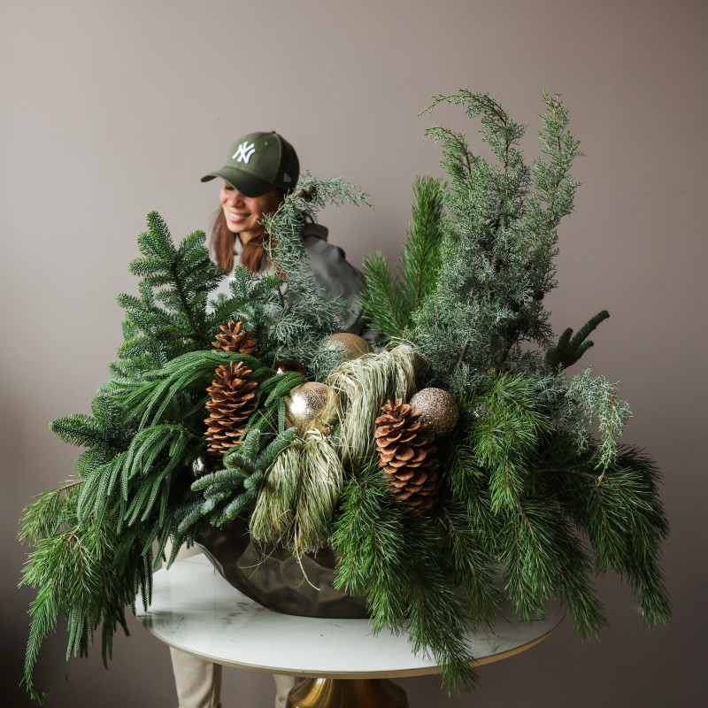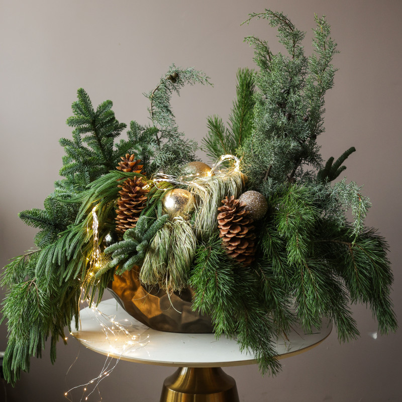 Элегантная композиция из живой хвои (пихта, сосна, туя), дополненная искусственными веточками хвои для объёма и пышности, украшена золотыми шариками и крупными кедровыми шишками. Натуральная текстура зелени и тёплые золотые акценты создают гармоничный праздничный образ, который прекрасно смотрится как в домашнем, так и в коммерческом интерьере. По желанию композицию можно дополнить гирляндой с диодами «водопад», чтобы усилить атмосферу мягкого свечения и зимнего уюта.