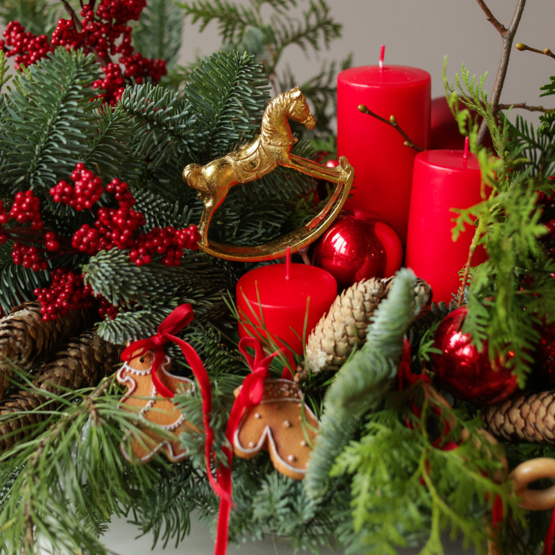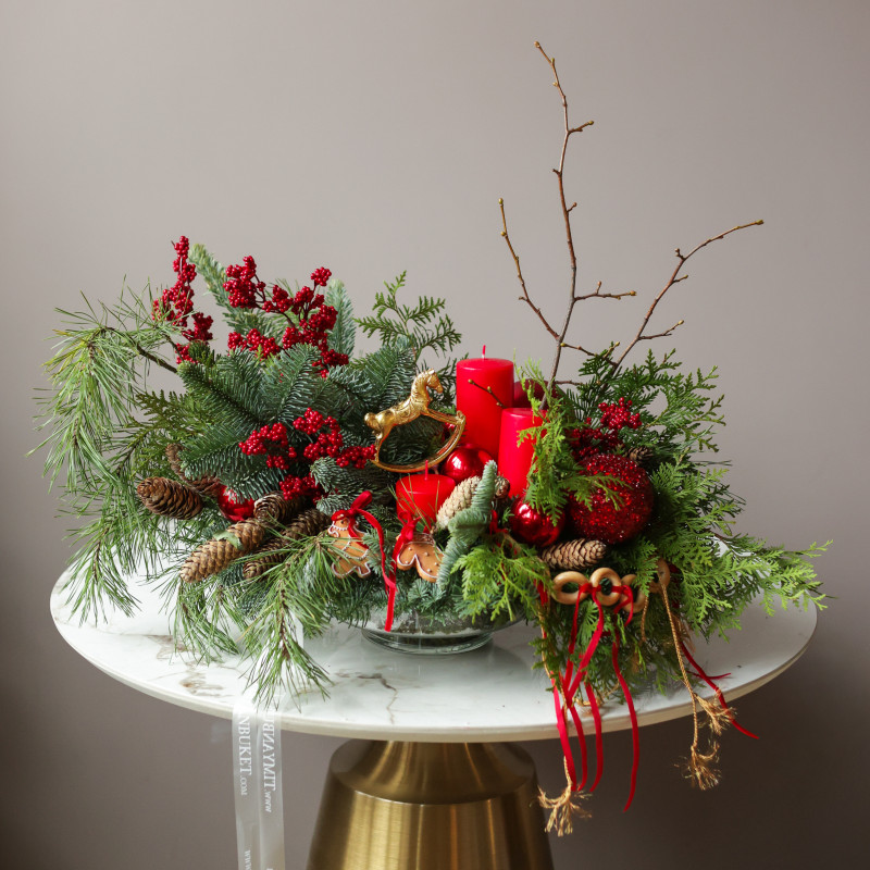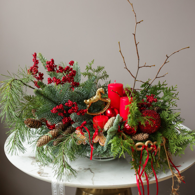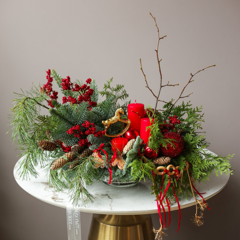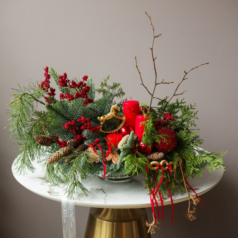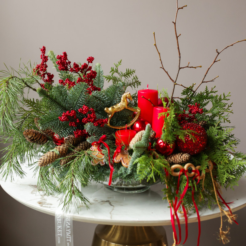 Эффектная новогодняя композиция из живой хвои (пихта, сосна, туя) с искусственными декоративными веточками и ягодами украшена шишками, красными шариками, гирляндой «баранки» и пряничными игрушками. Центральным акцентом являются две красные свечи-столбика и фигурка золотой лошадки-качалки, которые создают праздничное настроение и атмосферу уюта, добавляя интерьеру элегантности и зимней магии.
