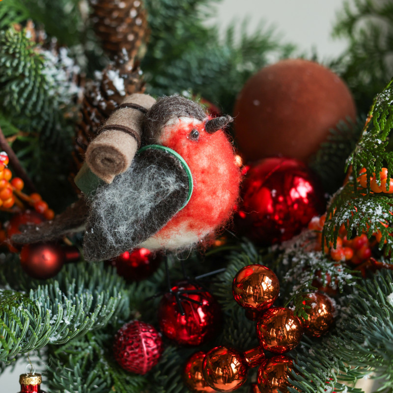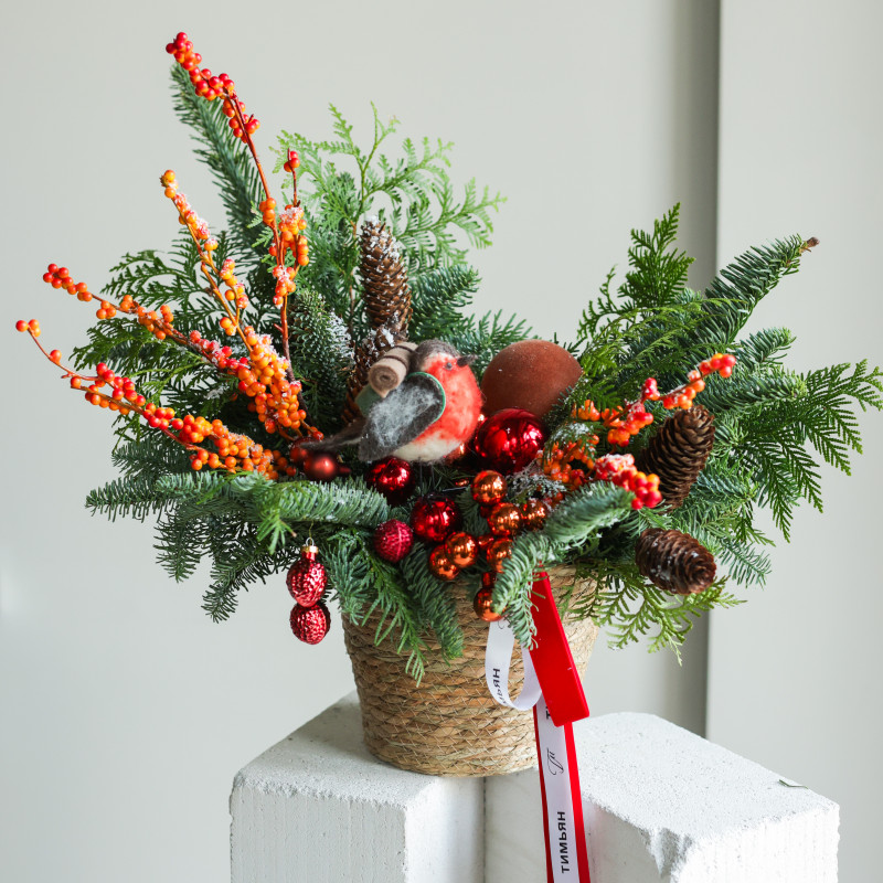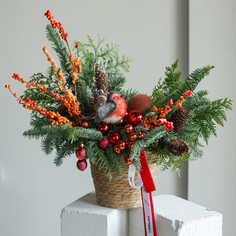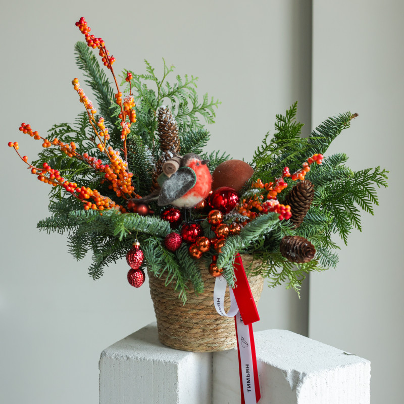 Композиция из живой хвои (пихта, туя) создаёт ощущение уютного зимнего уголка — свежая зелень, природные фактуры и мягкая яркость оранжевых ягод. Шишки и шарики добавляют праздничный блеск, а в центре устроился пухлый снегирь, будто прилетевший из заснеженного сада. Джутовая корзина подчёркивает натуральность и делает композицию универсальной для разных интерьеров.