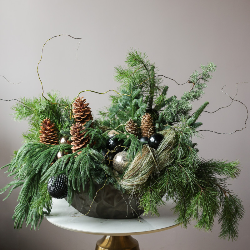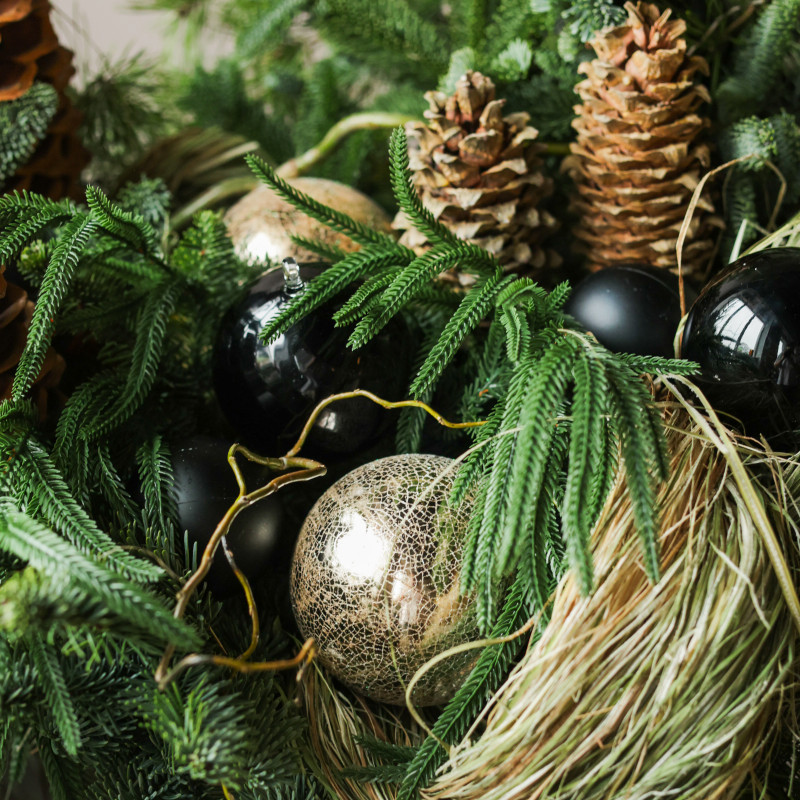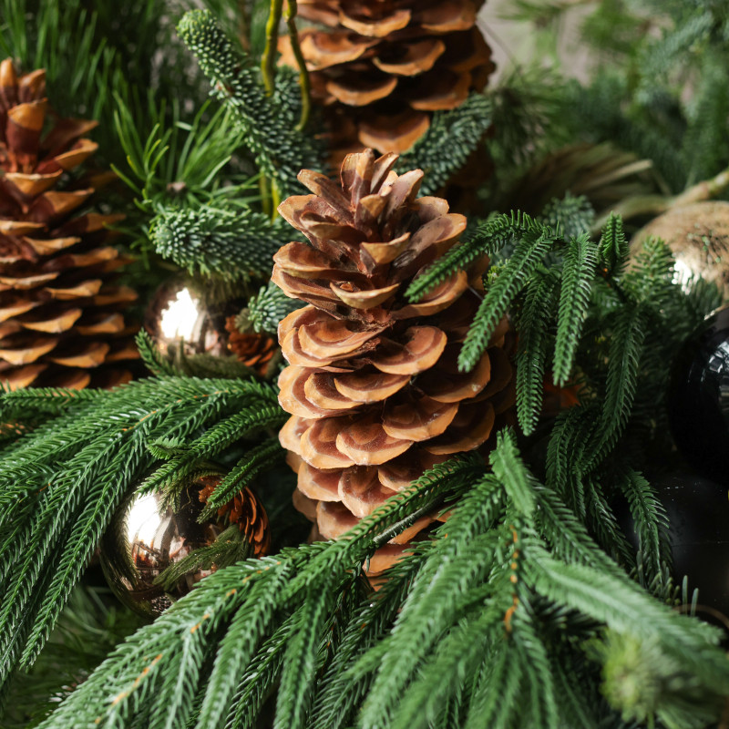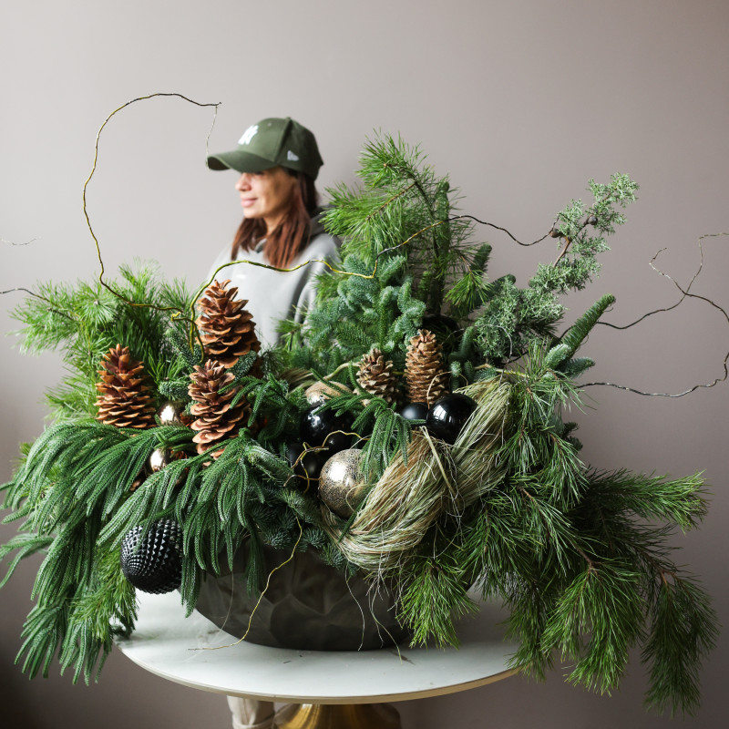 Современная композиция из живой хвои (пихта, сосна, туя) с искусственными веточками для объёма украшена стильными золотыми и черными шариками и крупными кедровыми шишками. Контраст тёмных и тёплых металлических оттенков создаёт эффектный и элегантный акцент, который гармонично впишется в интерьер квартиры, офиса или студии. Композиция придаёт праздничный характер пространству, оставаясь при этом утончённой и сдержанной.