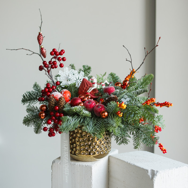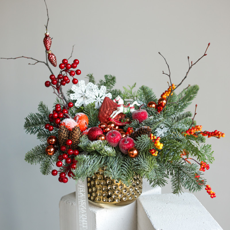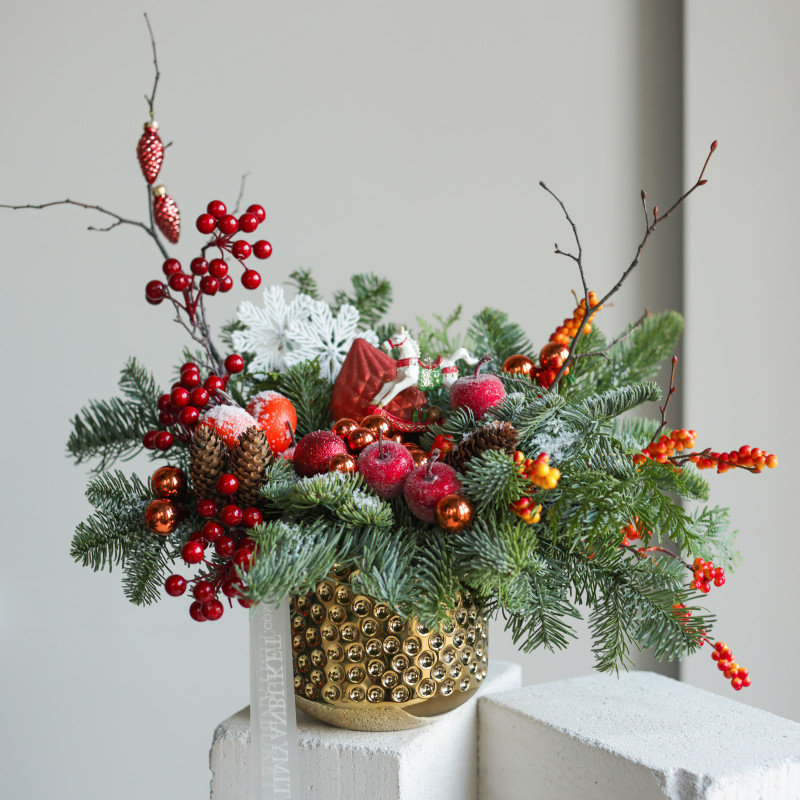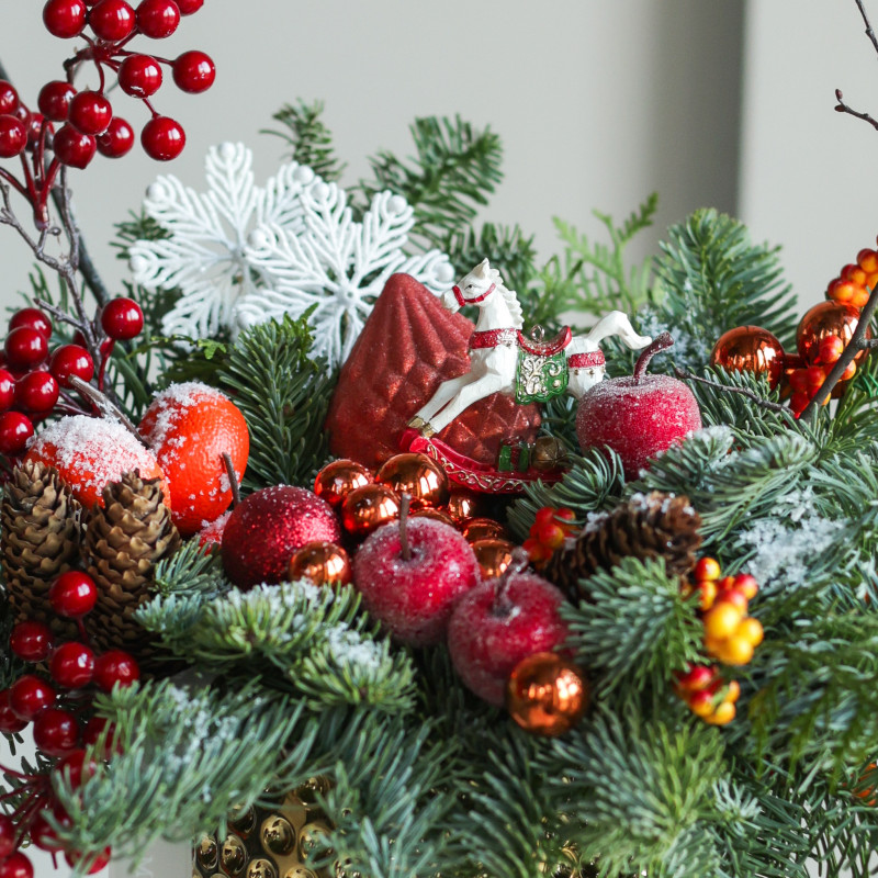 Композиция из живой хвои (пихта) создаёт выразительный акцент — элегантный, ароматный и по-настоящему праздничный. Богатая фактура хвои дополнена яркими искусственными веточками с красными и оранжевыми ягодами, шишками, декоративными яблочками и шариками, а в центре — лошадка, придающая сцене сказочный характер. Золотое кашпо делает композицию эффектным украшением любого интерьера.