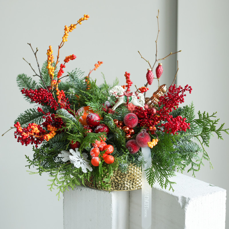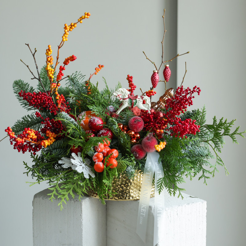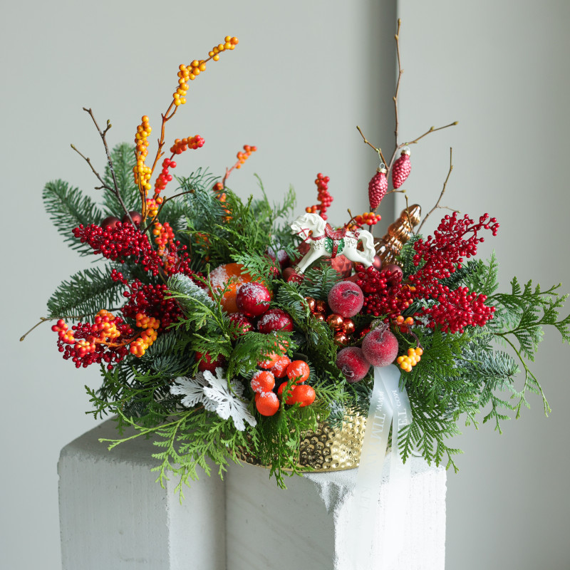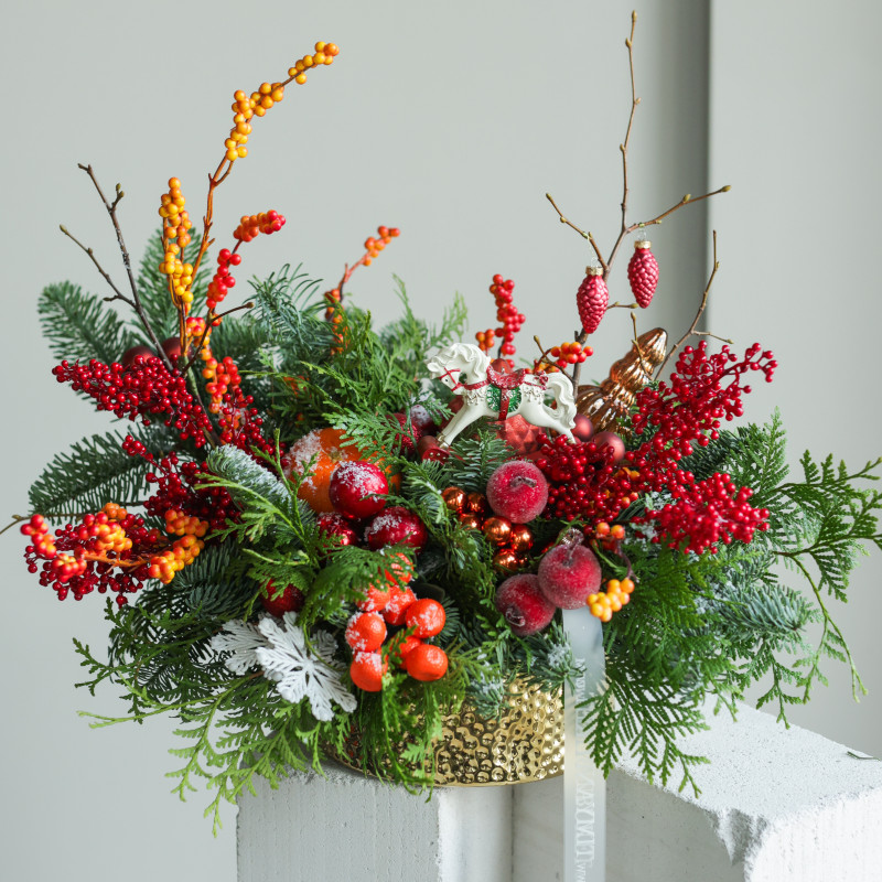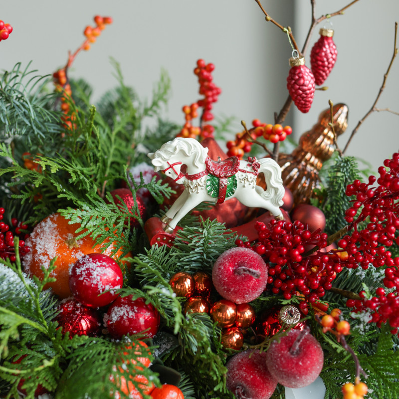Яркая и тёплая композиция из живой хвои (пихта, туя) оформлена в насыщенной красно-оранжевой палитре, создающей атмосферу уюта и новогоднего сияния. Золотое кашпо подчёркивает праздничный характер оформления, а акцентом служат веточки с искусственными ягодами, декоративные мандаринки и яблочки, а также изящная фигурка лошадки, задающая композиции сказочный мотив.