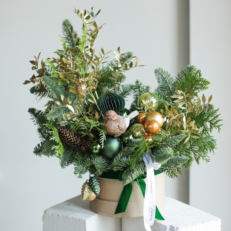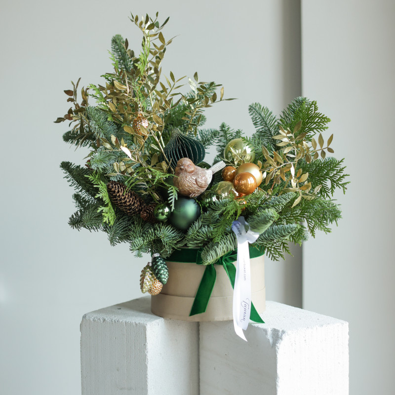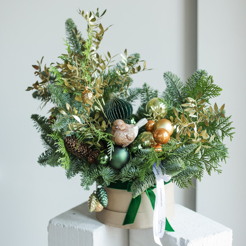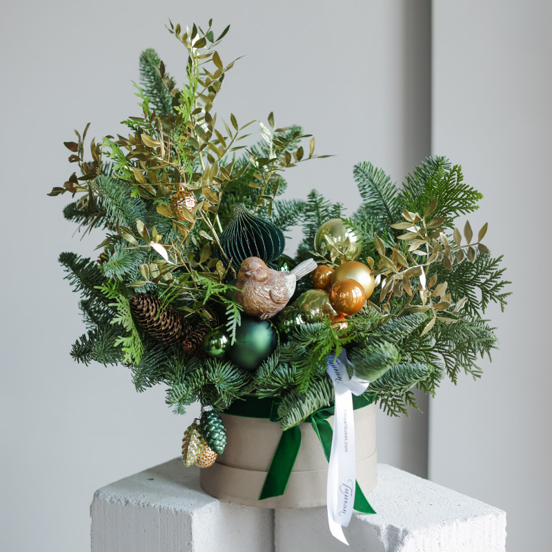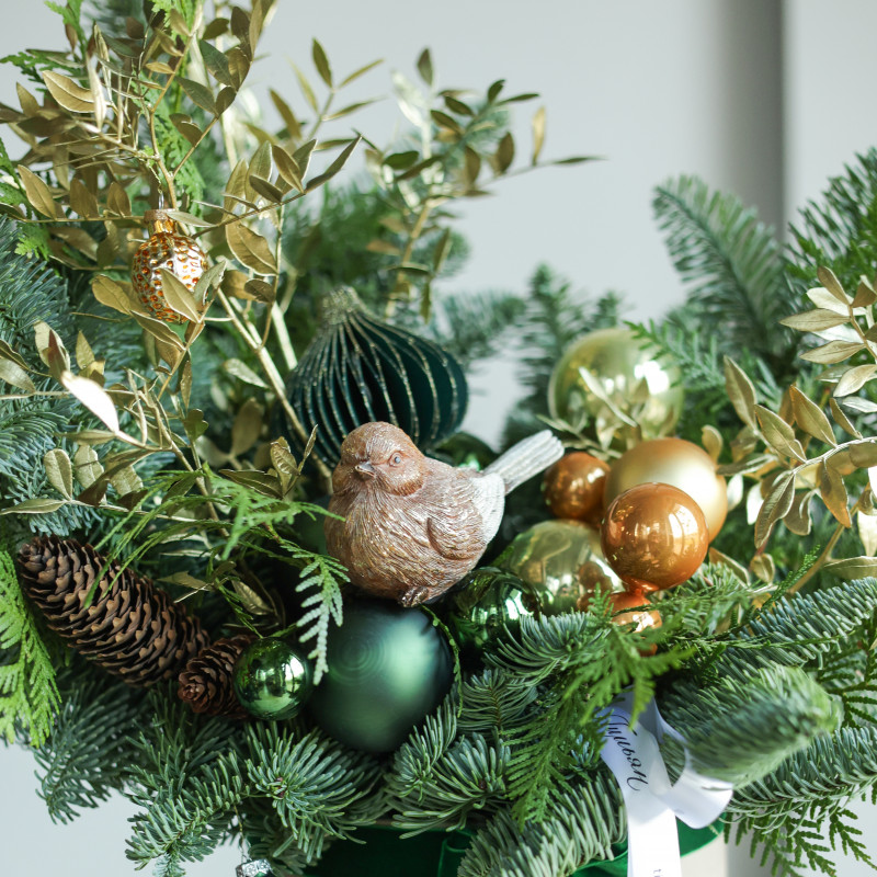 Композиция из живой хвои (пихта и туя) выполнена в благородной оливково-изумрудной гамме, создавая мягкое, стильное и уютное настроение. Нежные золотые акценты, шишки и изумрудные шарики подчеркивают природную фактуру хвои, а маленький воробушек в центре добавляет теплую, трогательную деталь — словно зимняя история ожила прямо в интерьере.