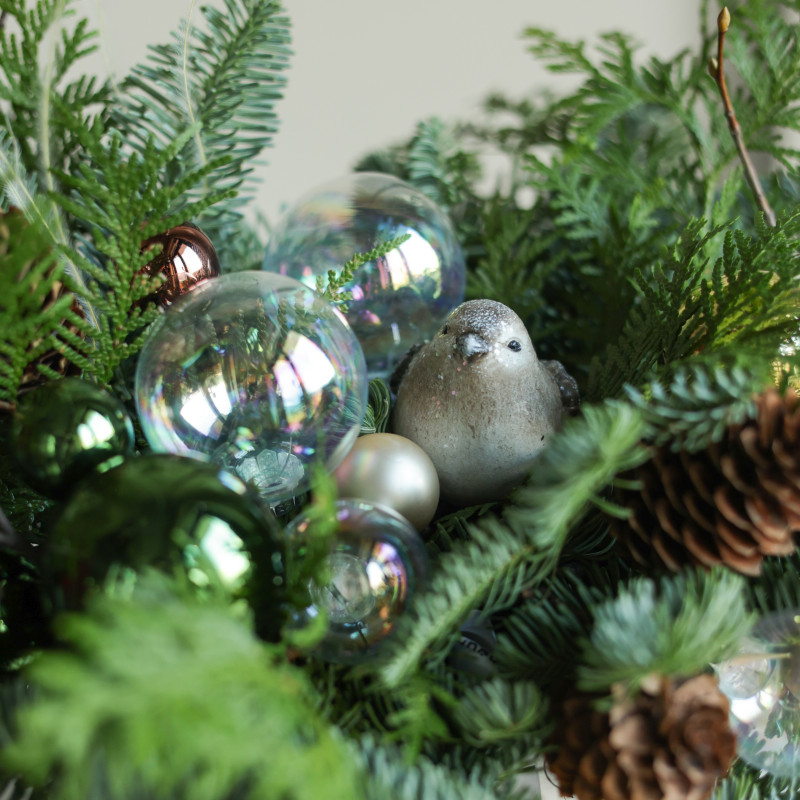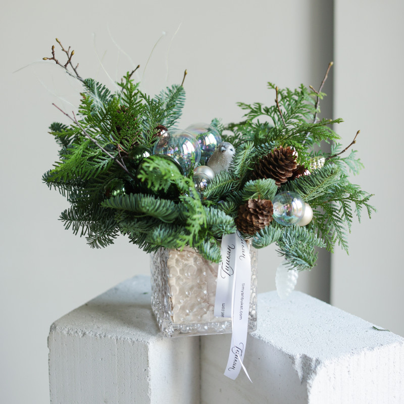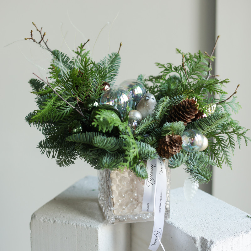 Композиция из живой хвои в прозрачном стеклянном кашпо создаёт лёгкую и праздничную атмосферу. Прозрачные и зелёные шарики, натуральные шишки и фигурка воробушка делают её особенно очаровательной. Идеально подойдёт для размещения на подоконнике, журнальном столике, рабочем столе или комоде, добавляя интерьеру нотки зимней сказки и уюта.