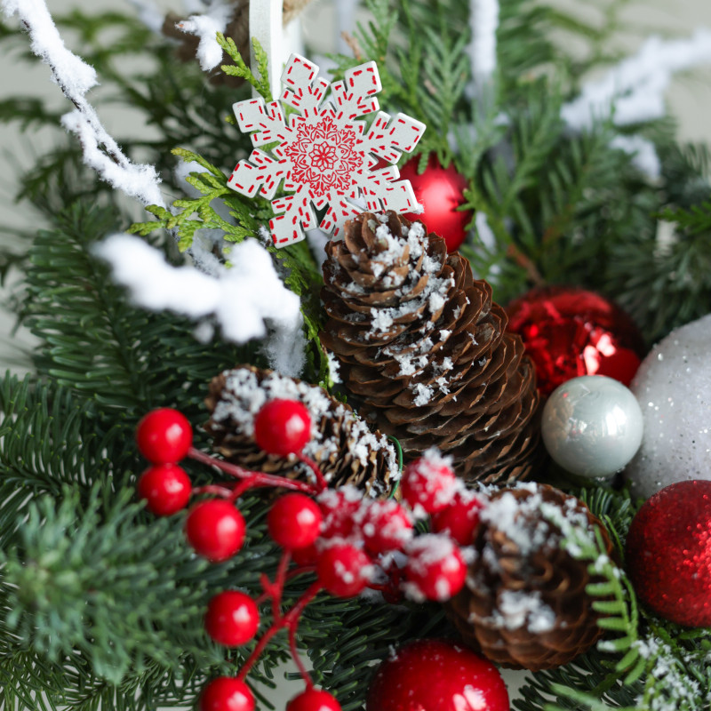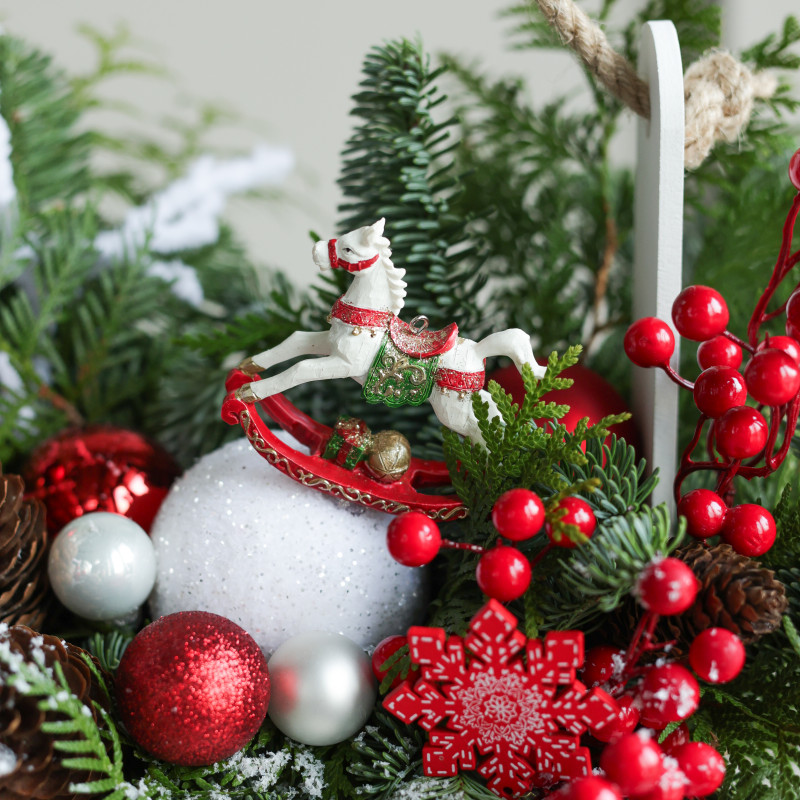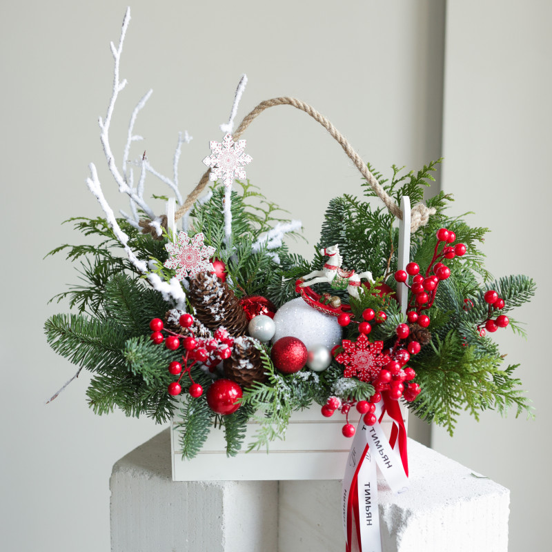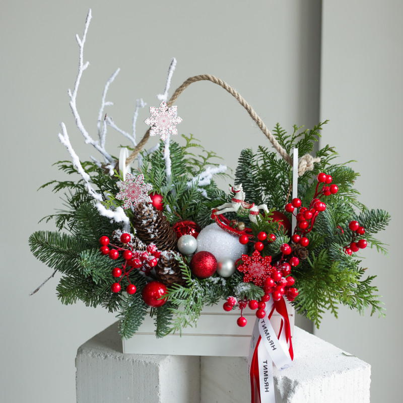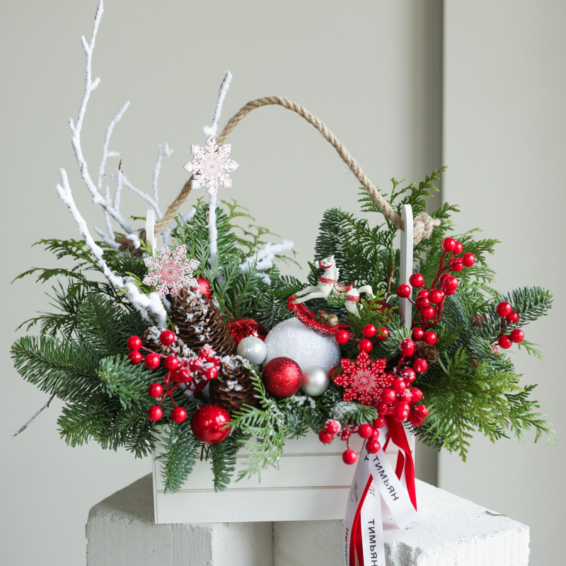 Композиция из живой хвои (пихта и туя) в белом деревянном ящичке создаёт ощущение зимней свежести и домашнего тепла. Контраст нежной хвои и ярких красных акцентов делает её выразительной и праздничной, а лошадка в центре добавляет уютный сказочный штрих. Такое оформление подходит для размещения на подоконнике, каминной полке, прикроватной тумбе или в зоне входной группы, наполняя пространство атмосферой Нового года.