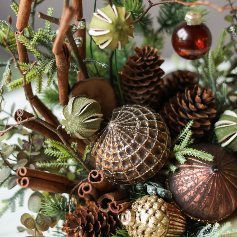 023i. Интерьерная композиция с теплым пряным декором, ветками и палочками корицы