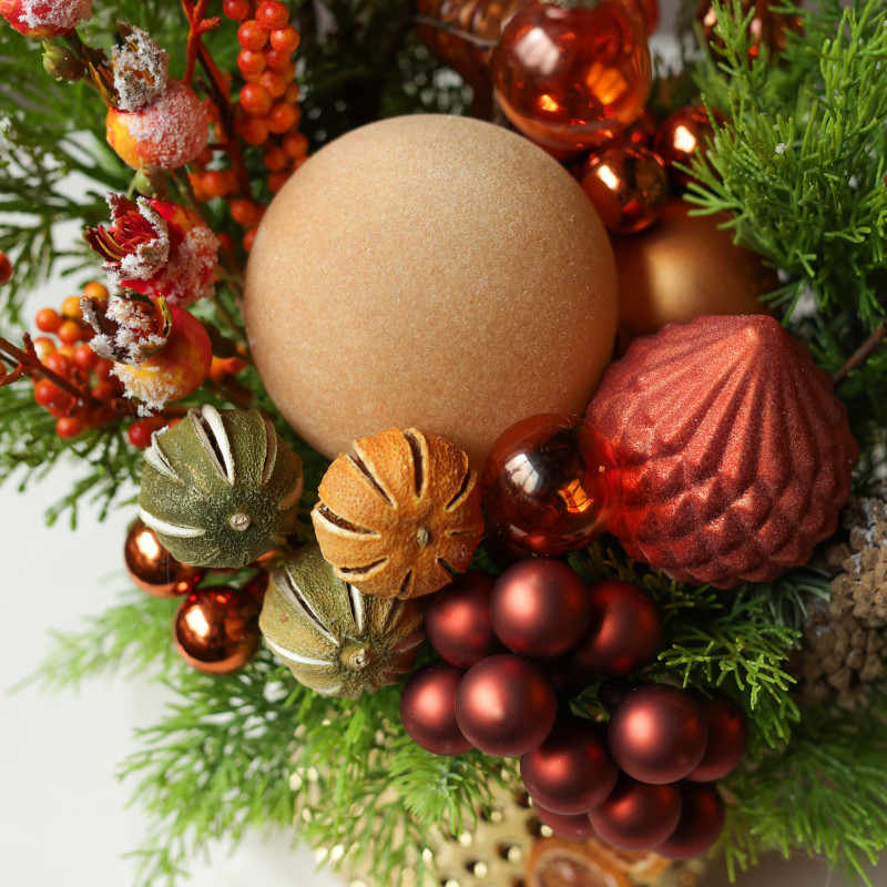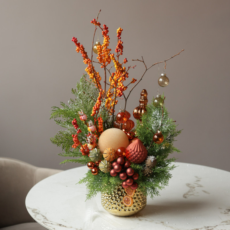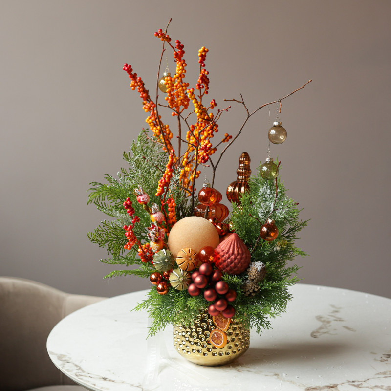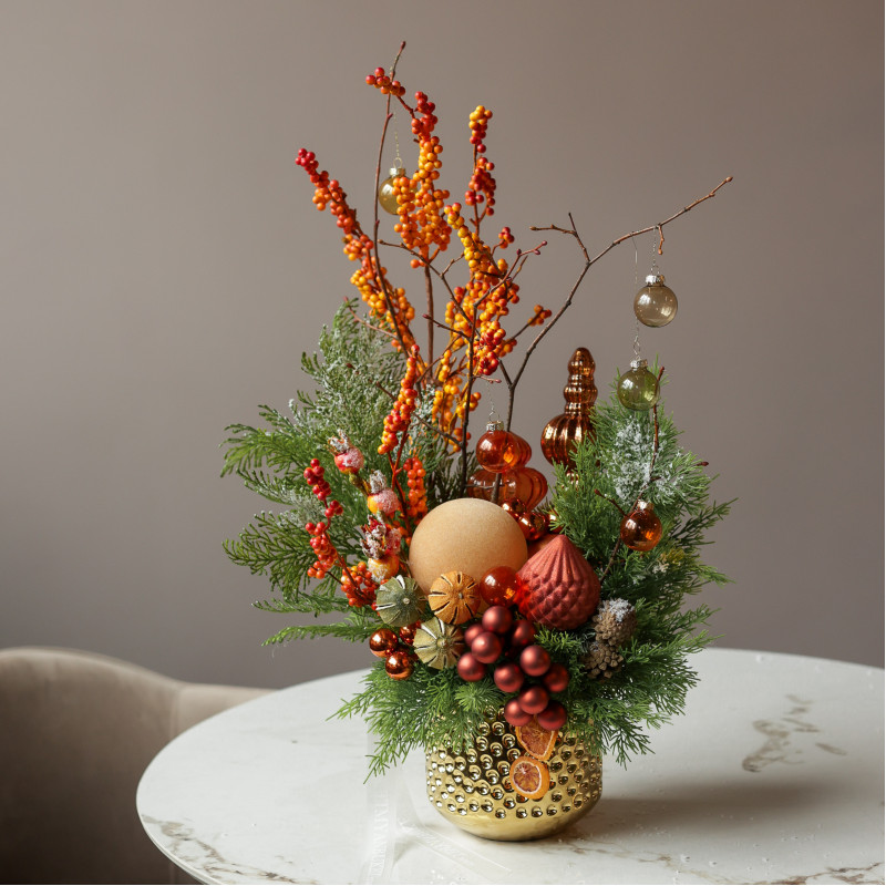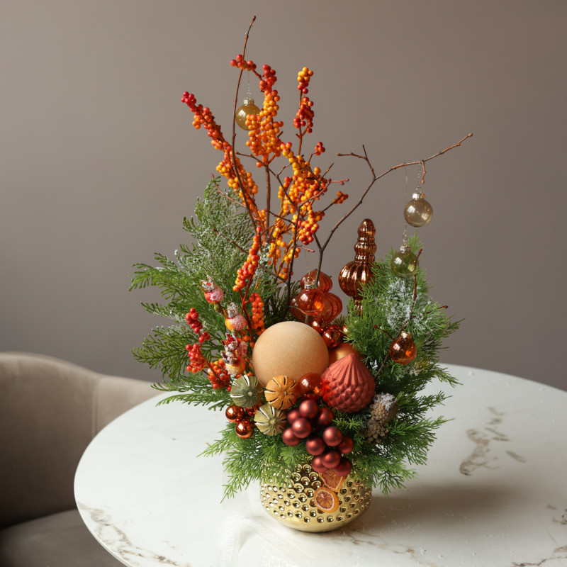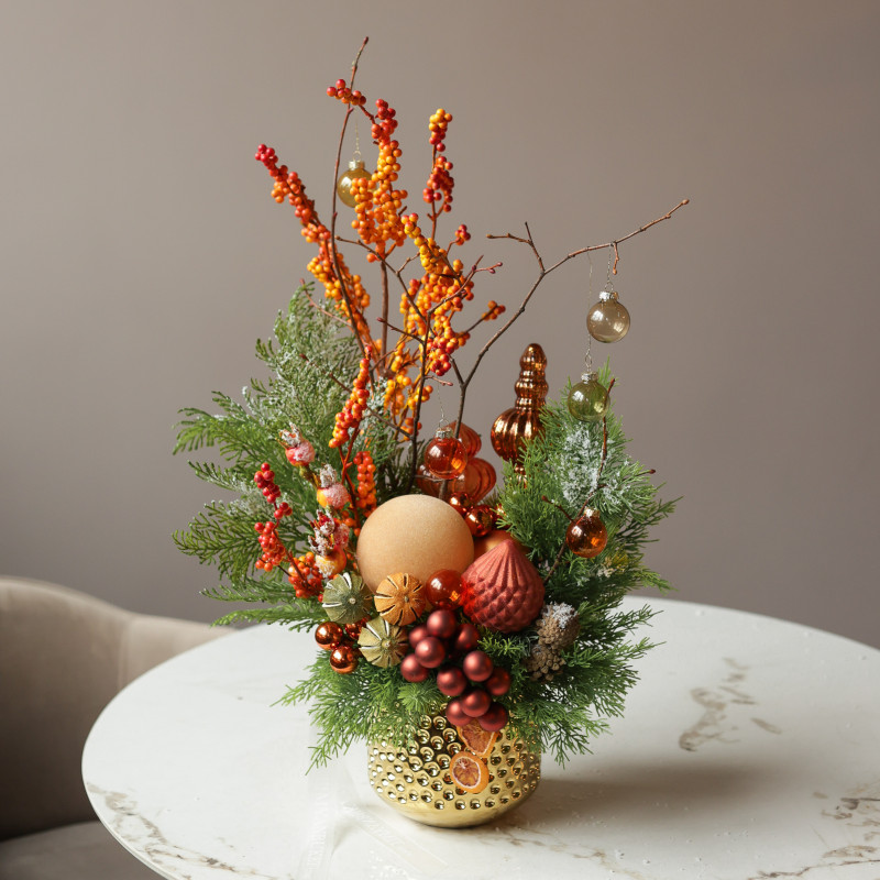 005i. Интерьерная новогодняя композиция в золотом кашпо с оранжевым декором и ягодами облепихи (иск.)