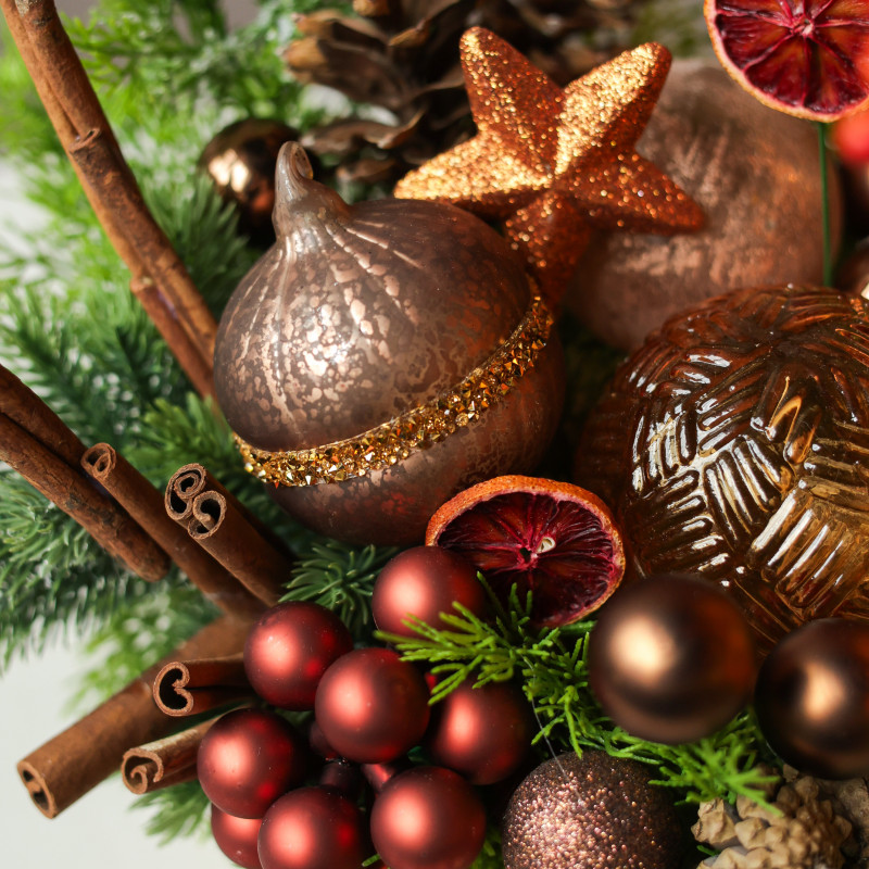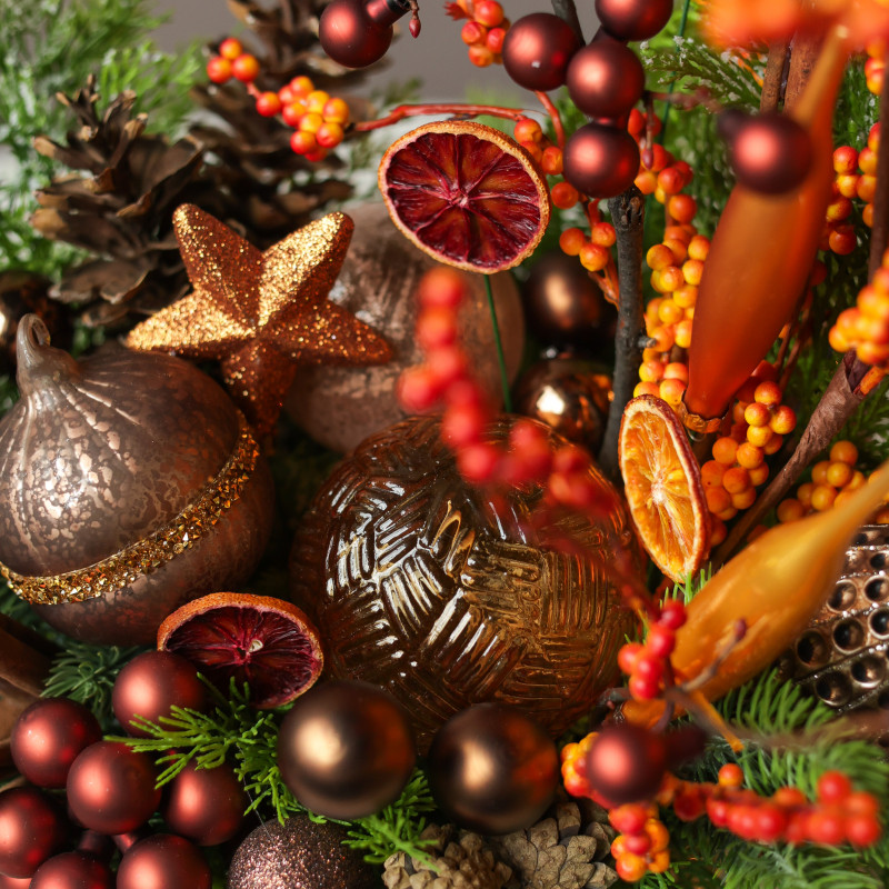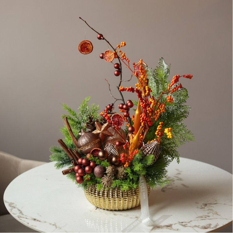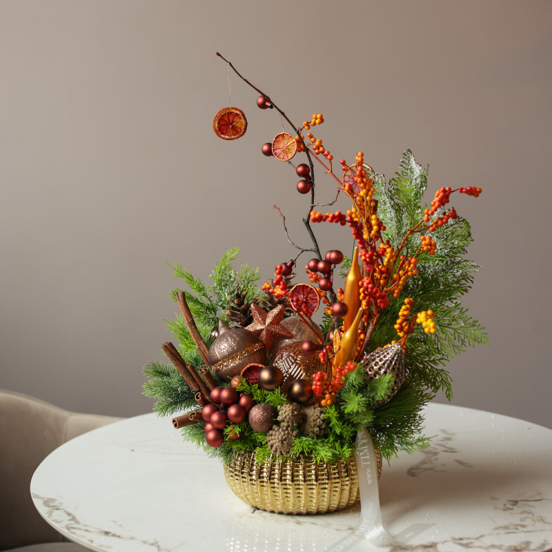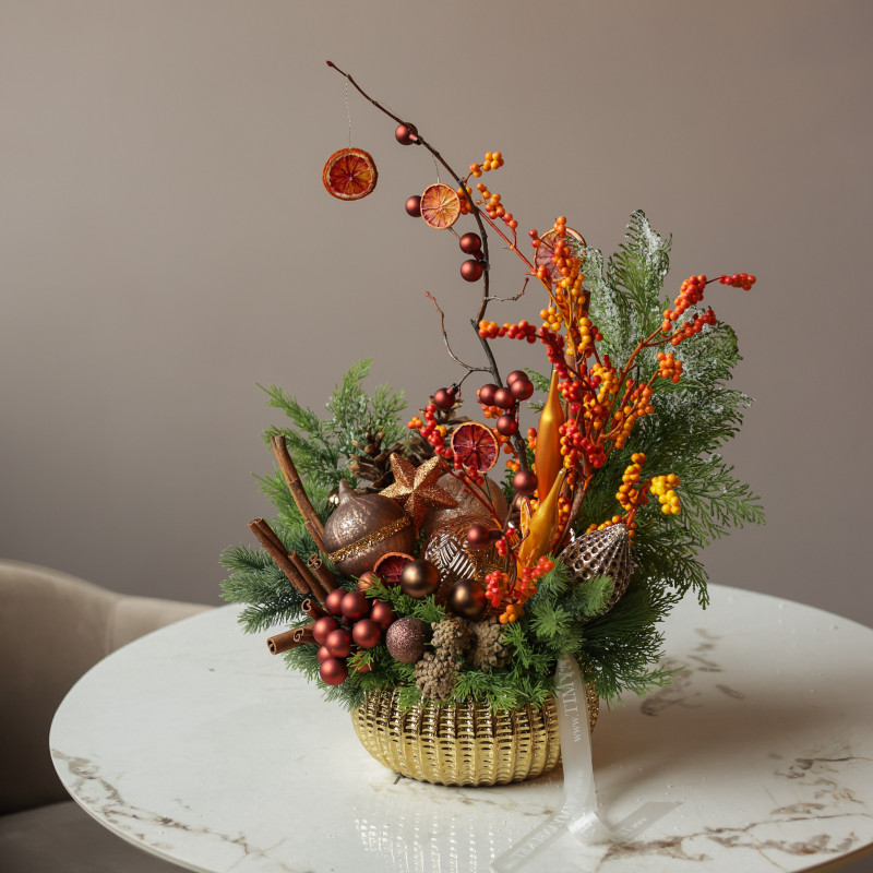 006i. Интерьерная новогодняя композиция с пряно-оранжевым декором и ягодами облепихи (иск.)