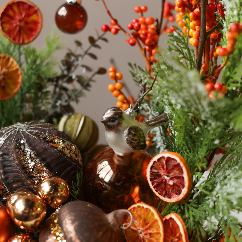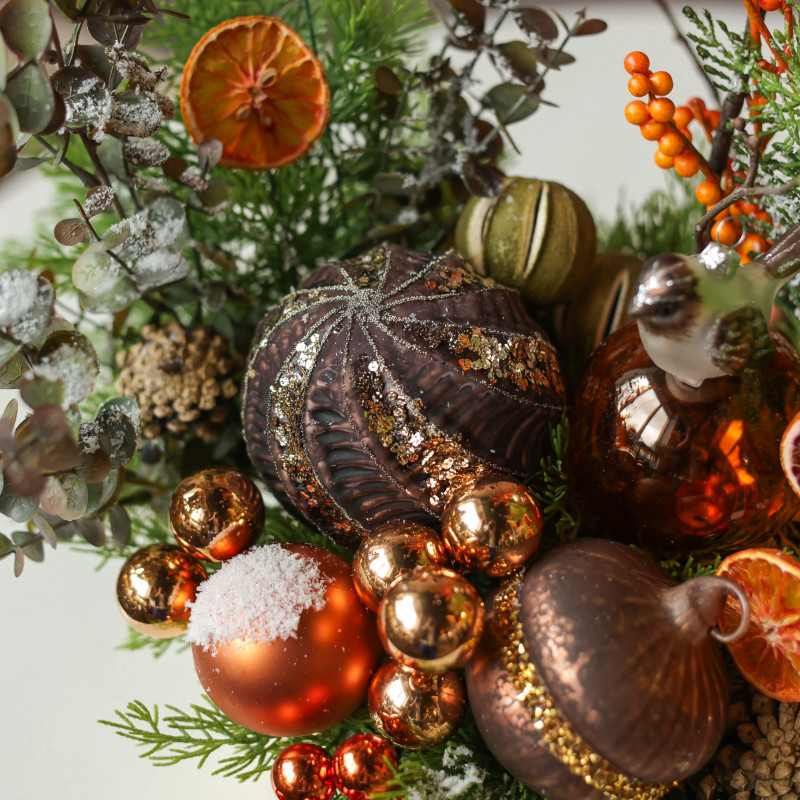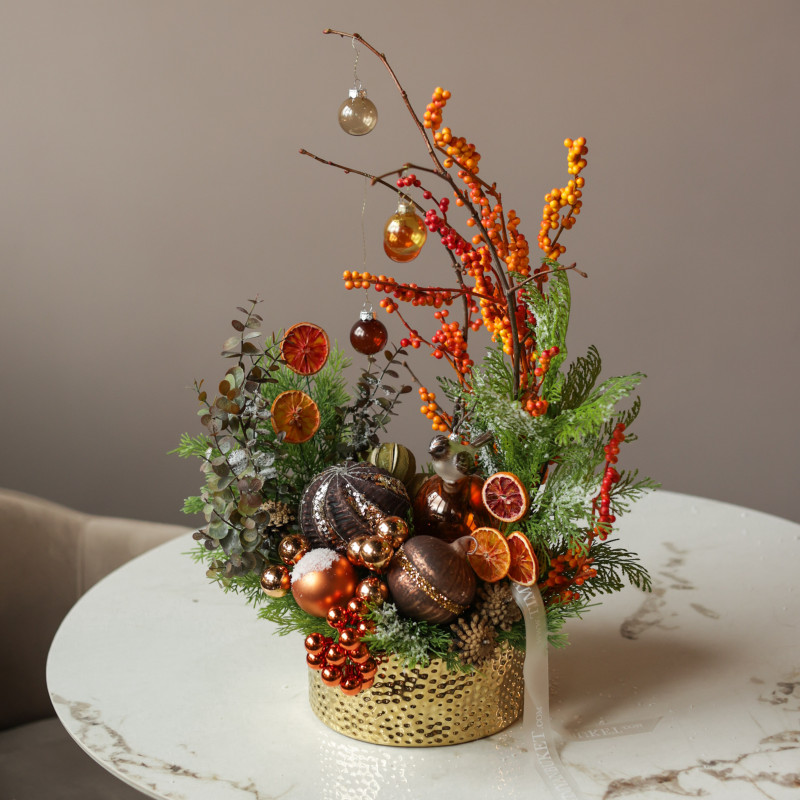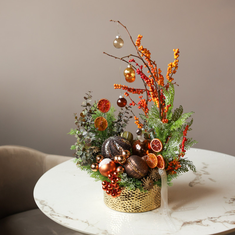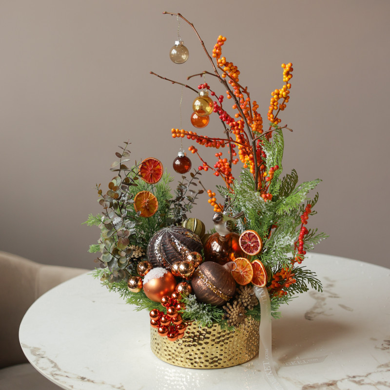 007i. Интерьерная новогодняя композиция с пряным бронзово-оранжевым декором в золотом кашпо