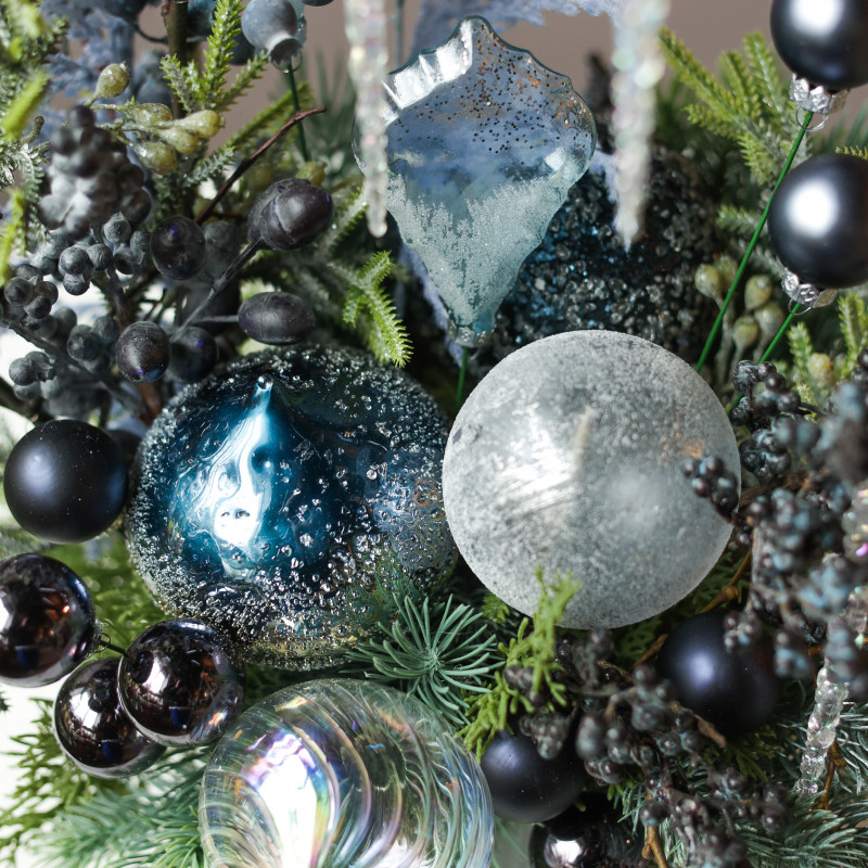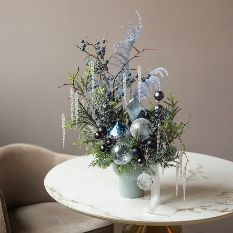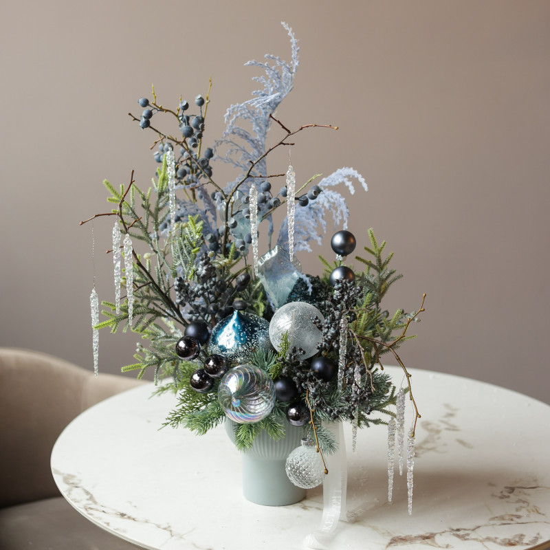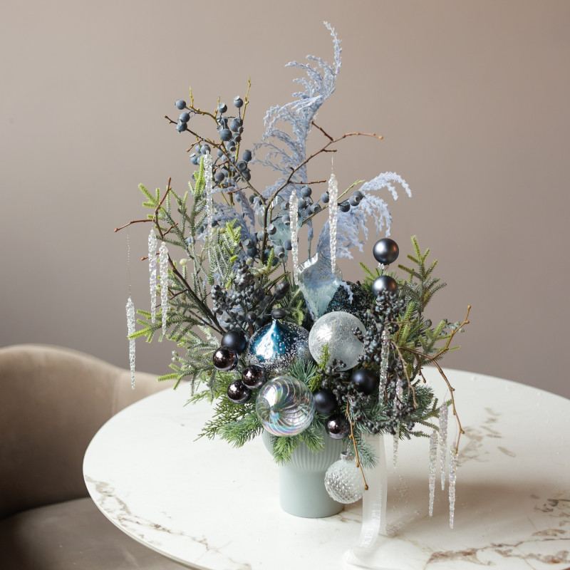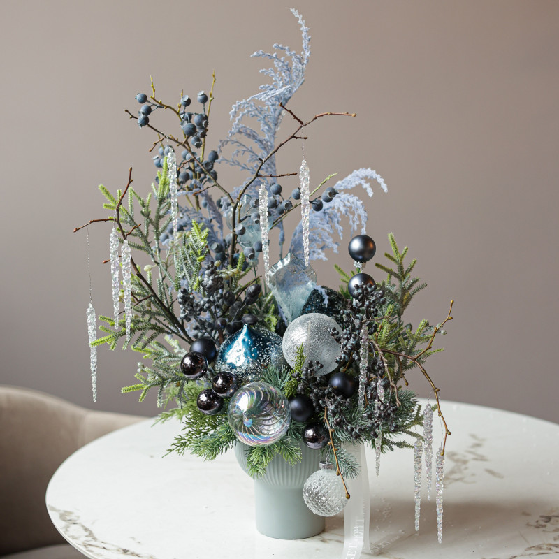 008. Новогодняя интерьерная композиция с туманно-синим декором с сосульками