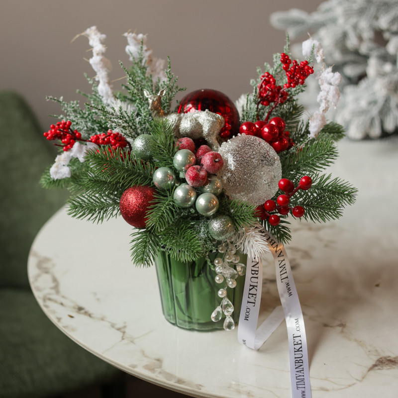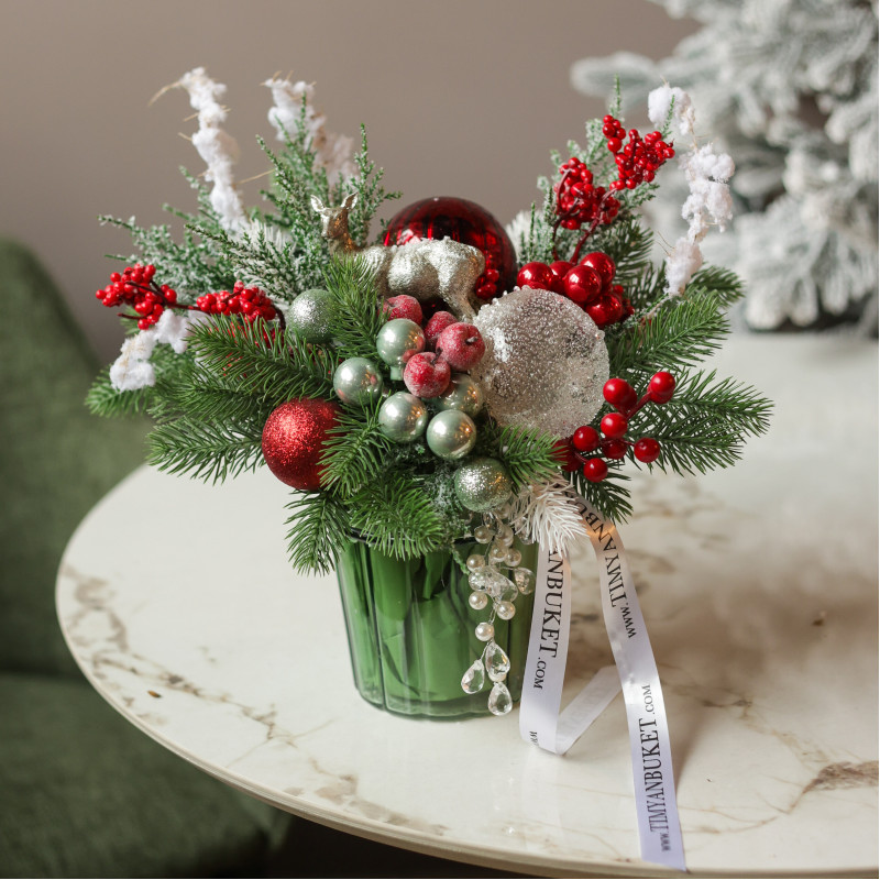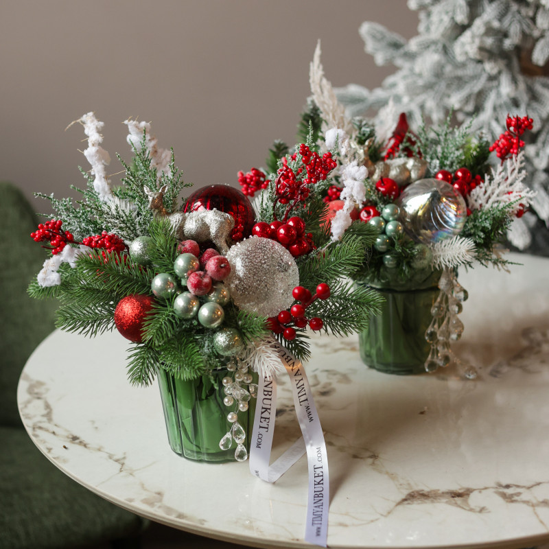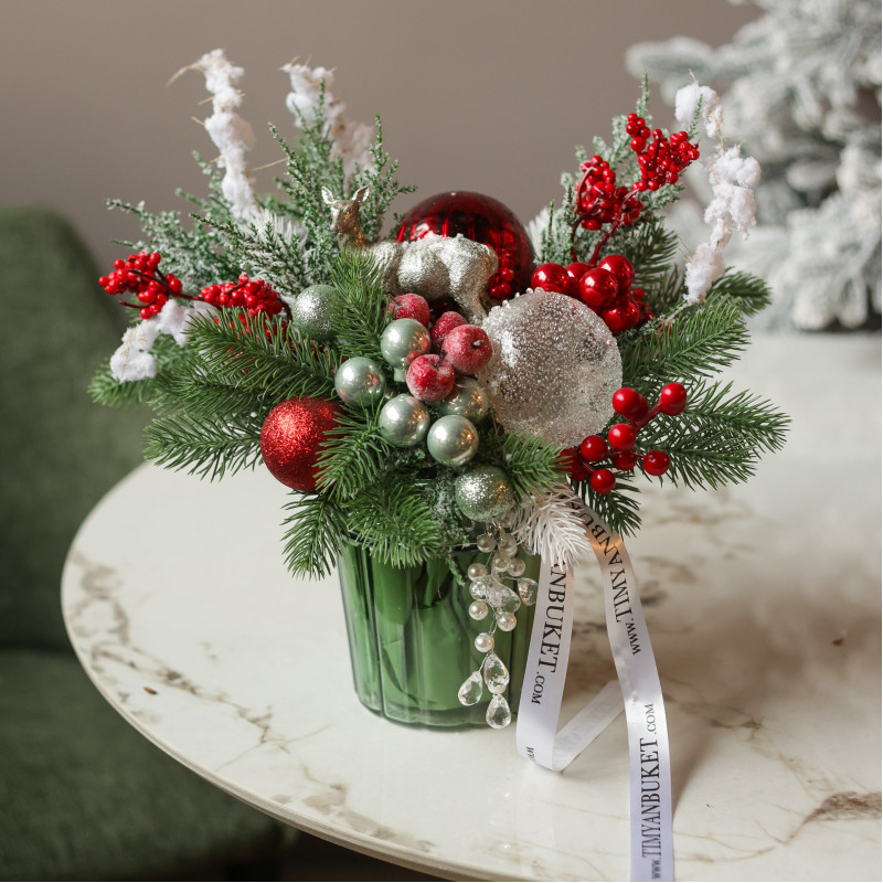 082. Новогодняя композиция в стакане с красно-серебряным декором