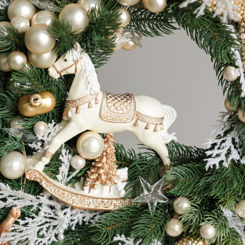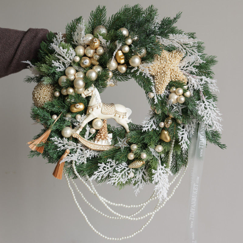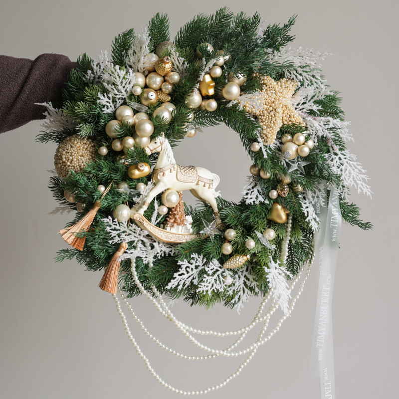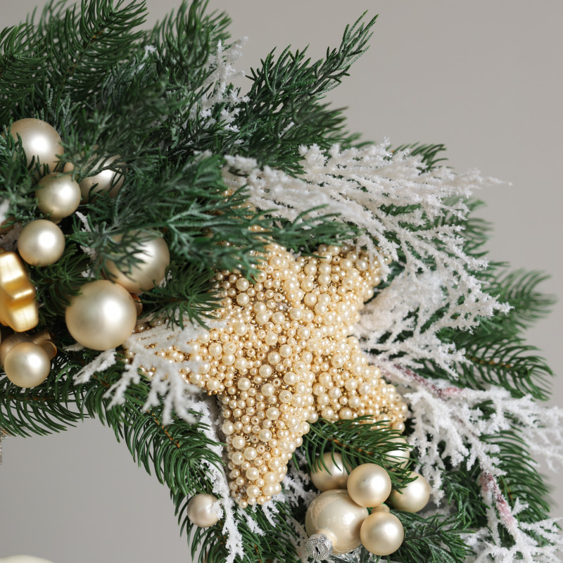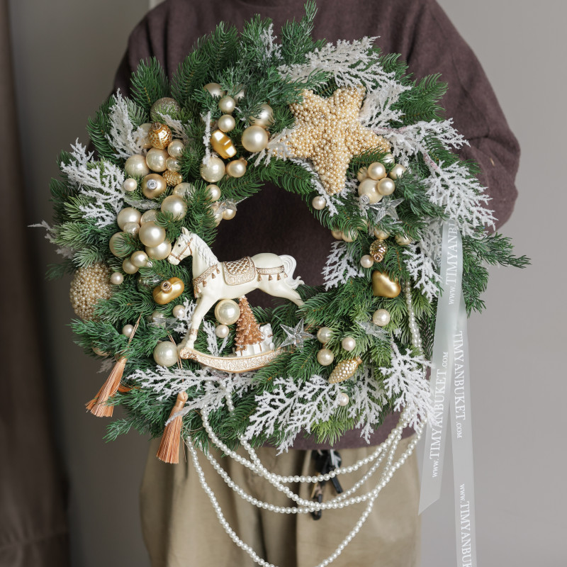 Элегантный венок из пушистой искусственной хвои выполнен в светло-золотой и жемчужной палитре. Белые декоративные веточки, жемчужные бусы, звезда, шарики и шелковые кисточки создают изысканный, мягко сияющий образ, который легко впишется в современный и классический интерьер. Идеально подходит для оформления входной двери, стены, над изголовьем кровати, каминной зоны или зоны фотосъёмки, добавляя дому праздничную утончённость и атмосферу зимней сказки.