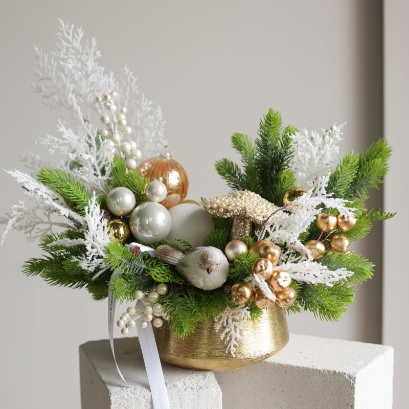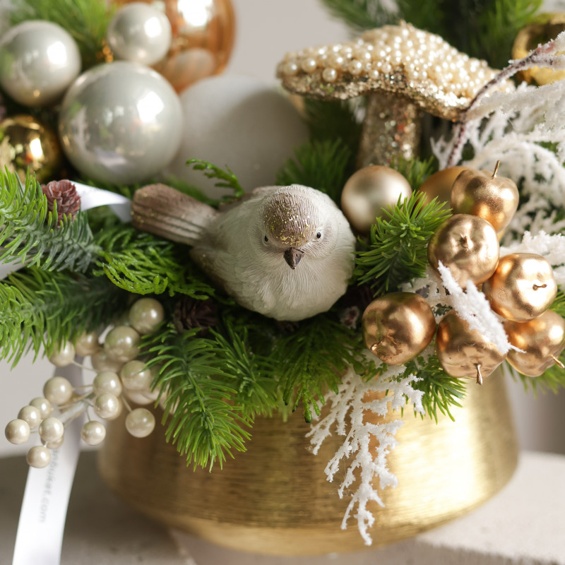 106. Композиция с бело-золотым декором с птицейй и жемчужным грибочком