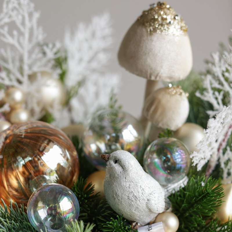 107. Композиция с белами веточками, птичкой и белыми фигурками грибов