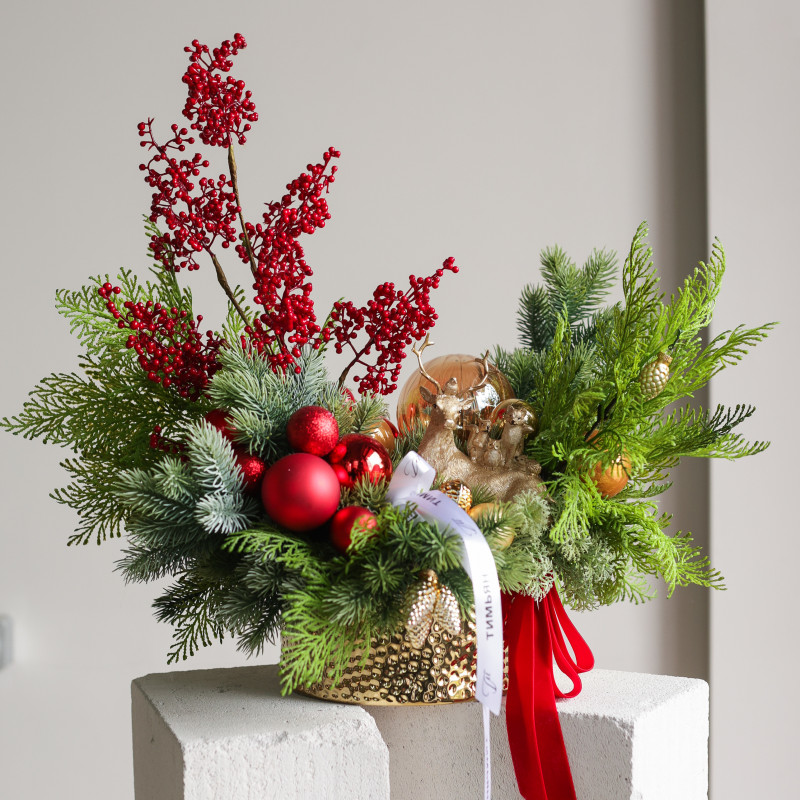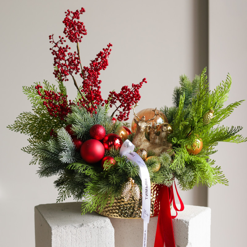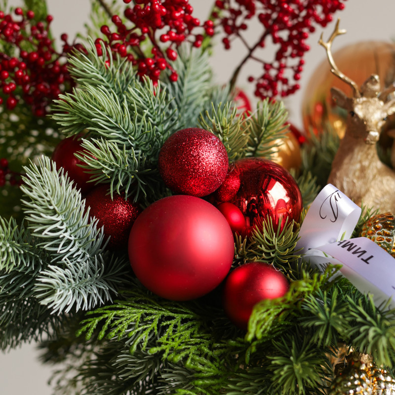 108. Новогодняя композиция с красно-золотым декором и золотым оленем
