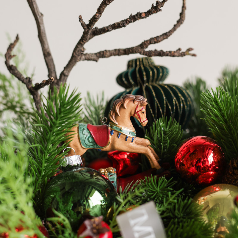 115. Композиция с деворактивными ветками, красным декором и лошадкой