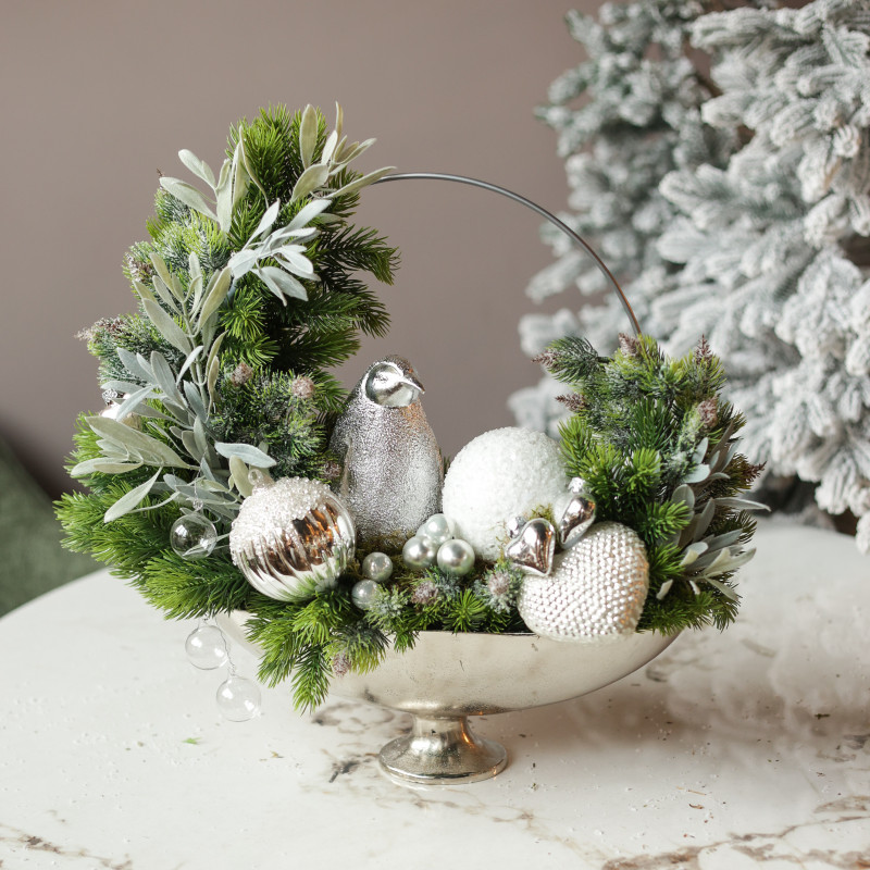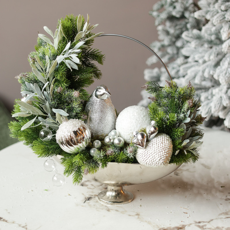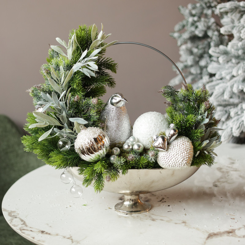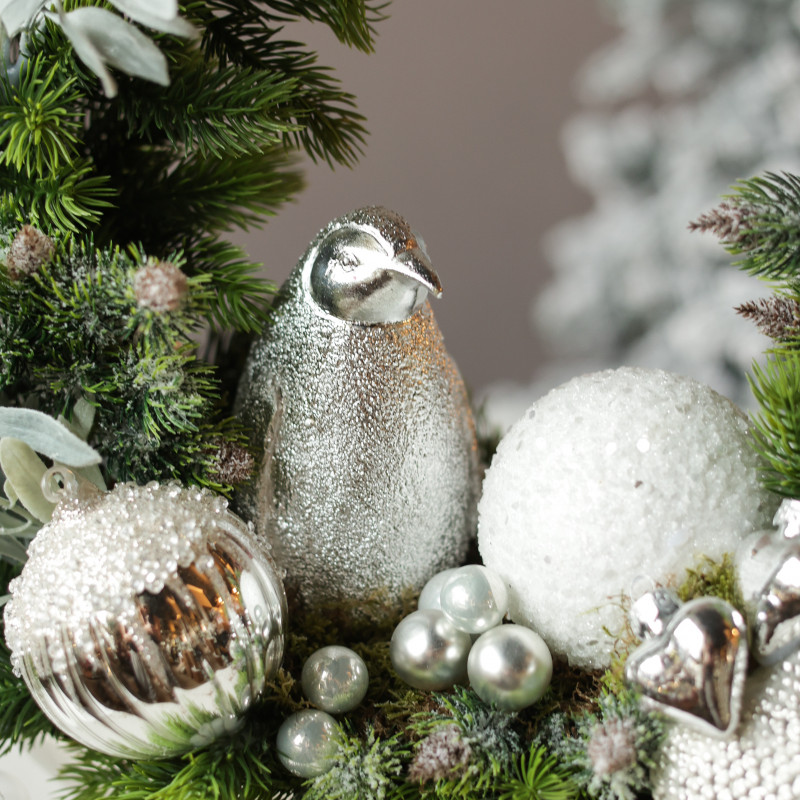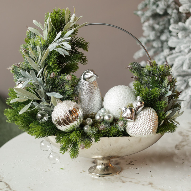 Декор: серебряный блестящий пингвин, декоративный обруч, серебряные сердечки, микс шариков, серебряный вазон на ножке