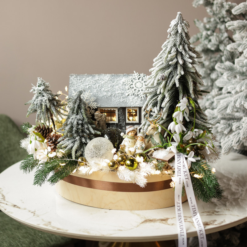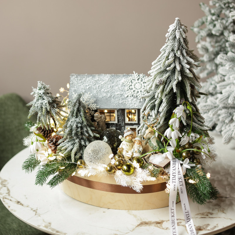 Уникальная новогодняя композиция в деревянном кашпо ручной работы создана дизайнерами студии ТимьянБукет в единственном экземпляре. В центре — деревянный домик с подсветкой, окружённый декоративными ёлочками, фигурками детей и нежными искусственными подснежниками. Натуральные шишки и елочные шарики придают композиции объем и текстуру, а светодиодная гирлянда с огоньками-звездочками добавляет мерцание и магию зимнего вечера. Эта композиция идеально подходит для украшения гостиной, каминной зоны или детской комнаты, создавая атмосферу уюта, тепла и праздничного настроения.