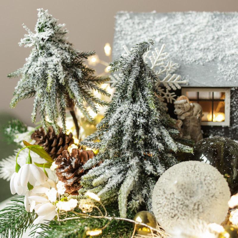 Декор: деревянный домик с подсветкой, декоративные ёлочки, фигурки детей, искусственные подснежники, натуральные шишки, елочные шарики, светодиодная гирлянда с огоньками-звездочками, деревянное кашпо ручной работы