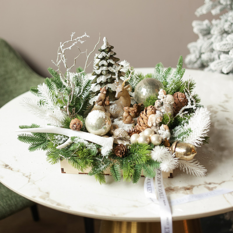 Будет аккуратно упакована и готова к дарению или размещению в интерьере. При желании можно добавить поздравление — мы вложим мини-открытку с вашим текстом. Композиция наполнит ваш дом праздничной атмосферой и создаст ощущение зимнего волшебства.