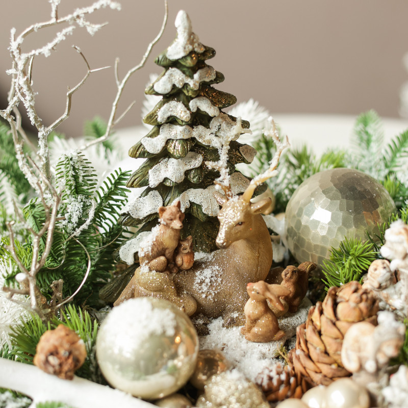 Декор: декоративная ёлочка, фигурка оленя, лесные животные, декоративный рог, натуральные шишки, елочные шарики, деревянный поднос