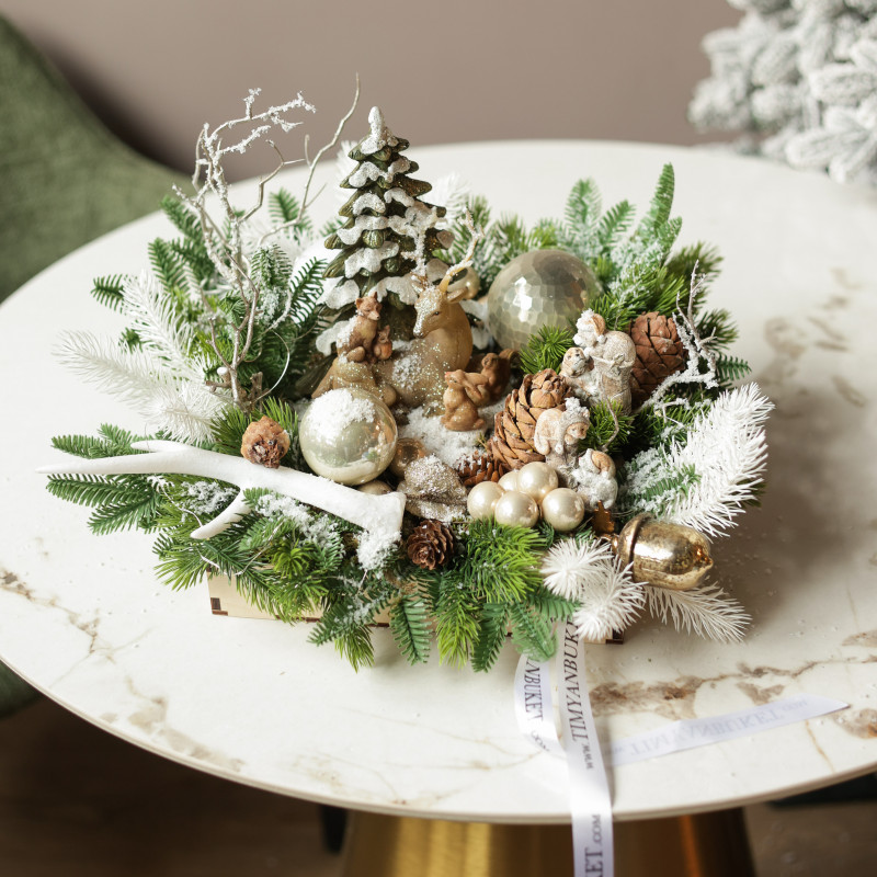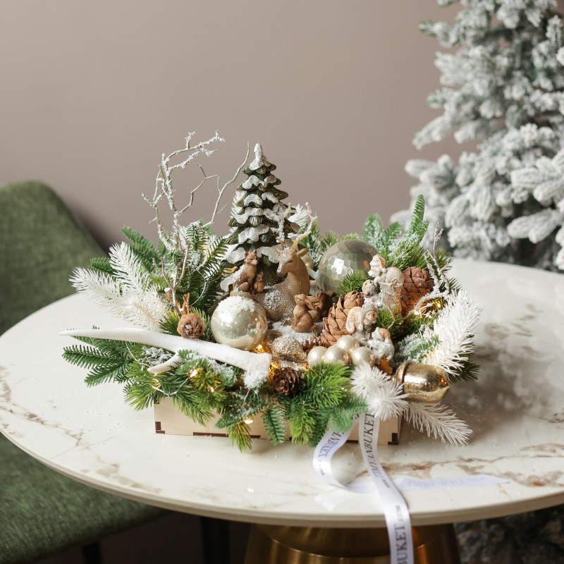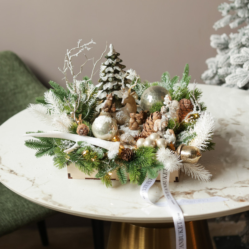 арт. 6199Эксклюзивная новогодняя композиция в деревянном подносе создана вручную дизайнерами студии ТимьянБукет в единственном экземпляре. В центре композиции расположена декоративная ёлочка, окружённая фигуркой оленя, лесными жителями и декоративным рогом, символизирующим изобилие и зимнюю сказку. Натуральные шишки и елочные шарики добавляют композиции текстуру и праздничный блеск. Это изысканное оформление идеально подойдёт для украшения гостиной, каминной зоны или праздничного стола и станет оригинальным подарком, создающим атмосферу уюта и волшебства.