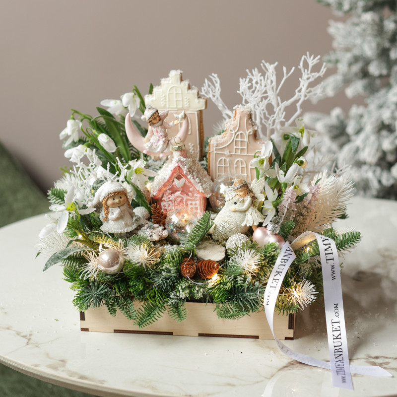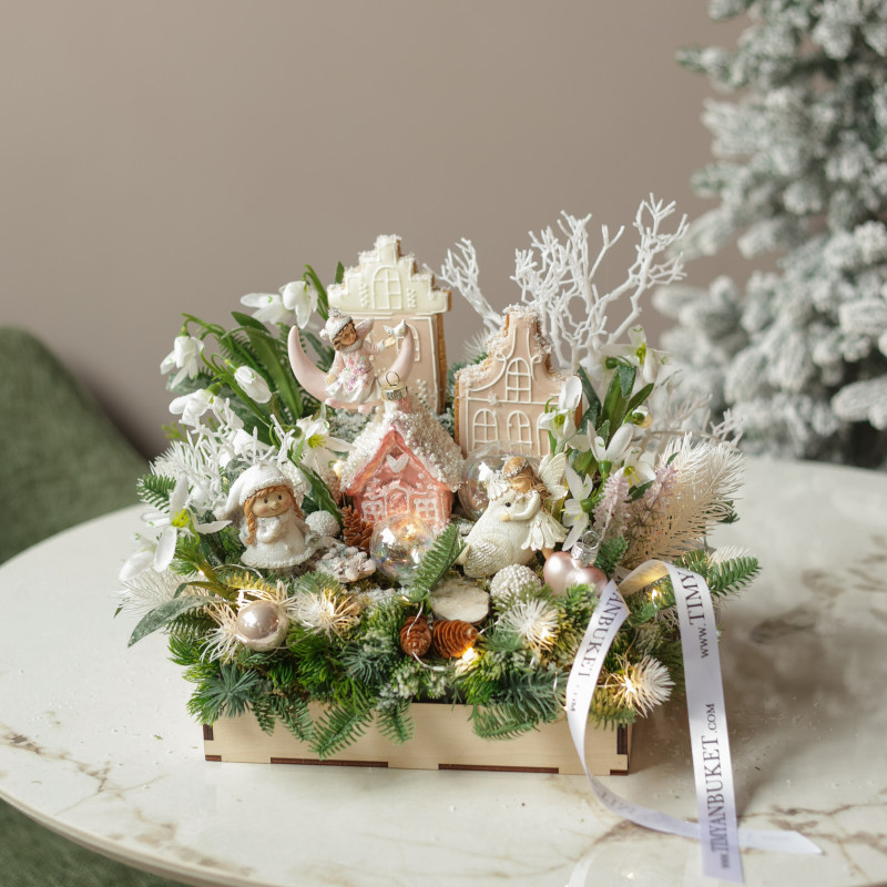 арт. 6200Очаровательная новогодняя композиция в деревянном подносе создана вручную дизайнерами студии ТимьянБукет в единственном экземпляре. Волшебная сцена с пряничными домиками, лунными эльфами, птичкой и феечкой оживает среди искусственных подснежников, декоративных веточек и мерцающих шариков. Светодиодная гирлянда роса добавляет мягкое сияние, создавая атмосферу зимней сказки и уюта. Эта композиция станет ярким акцентом праздничного декора, подчеркнёт чувство стиля и наполнит дом атмосферой волшебства и вдохновения.