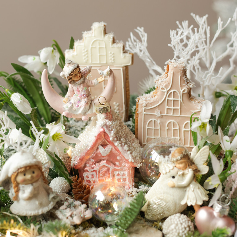 Декор: пряничные домики, фигурки лунных эльфов, птичка, феечка, искусственные подснежники, декоративные веточки, елочные шарики, гирлянда роса, деревянный поднос