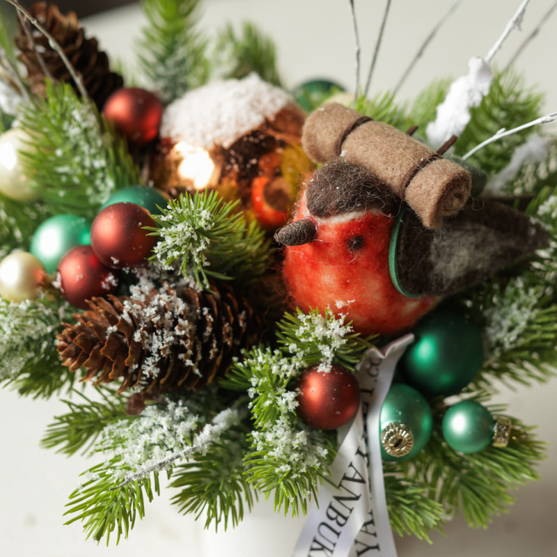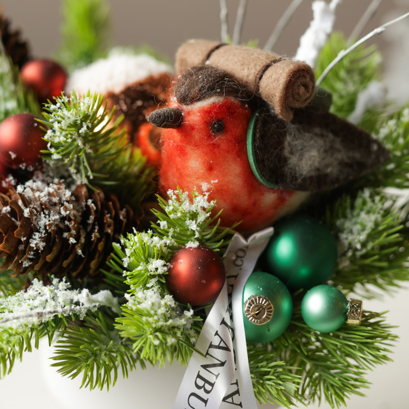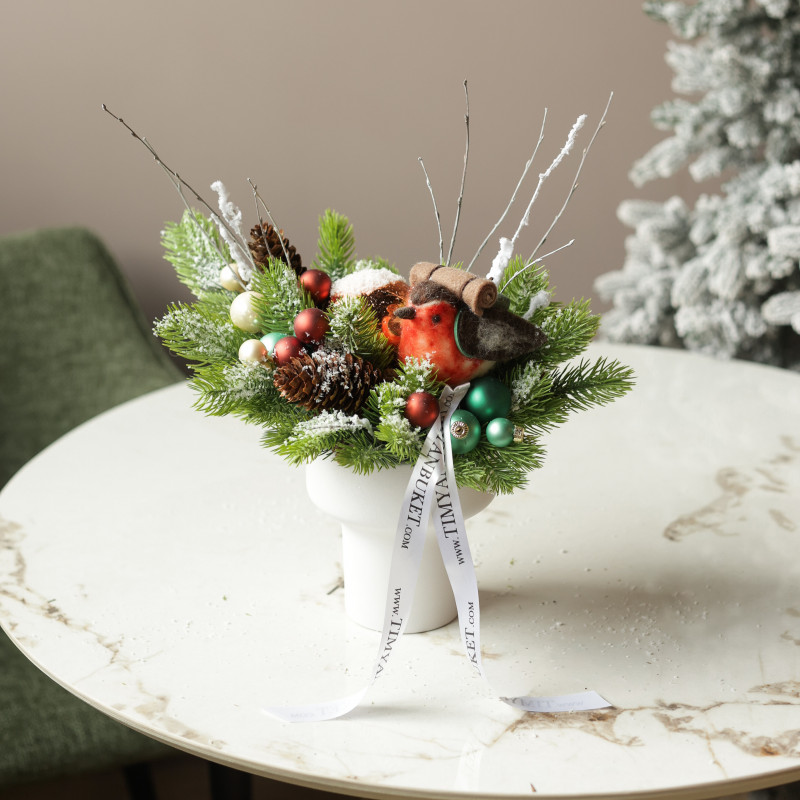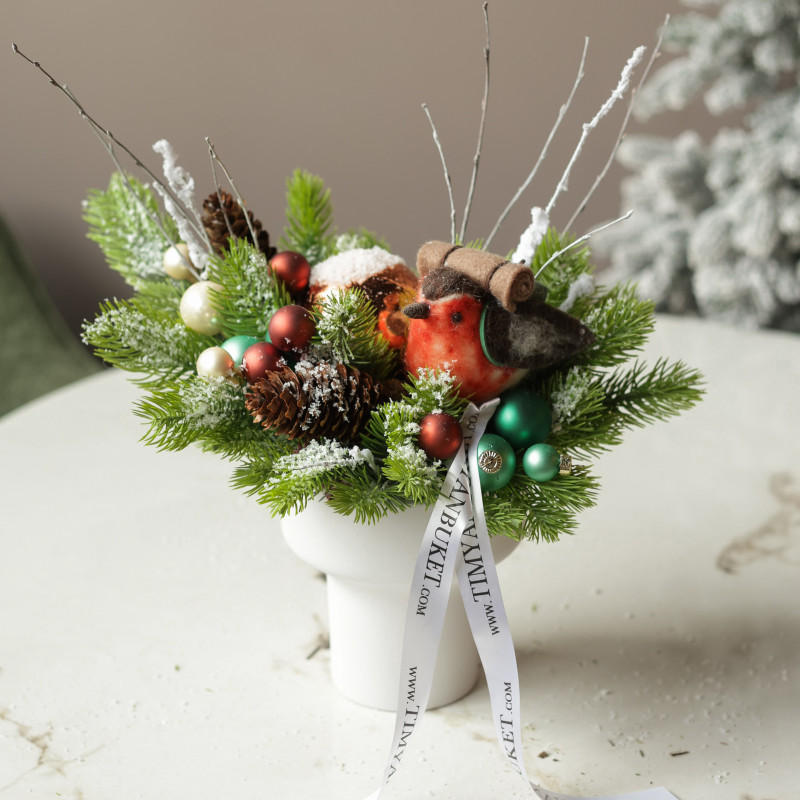 049. Новогодняя композиция в кашпо с пузатым снегирем
