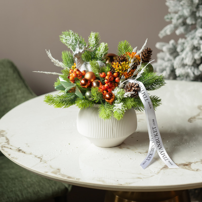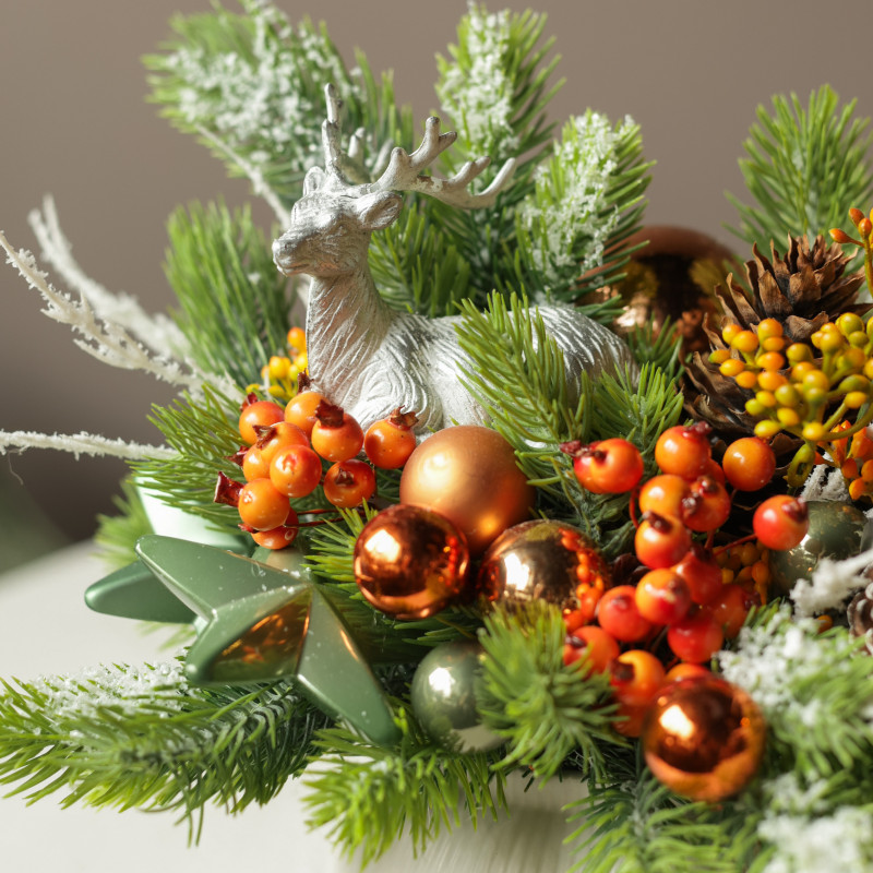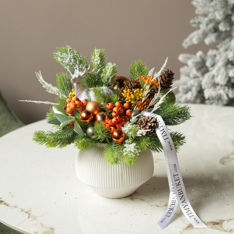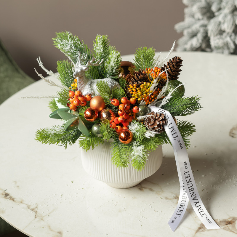 050. Новогодняя композиция в кашпо с оранжевым декором и оленем