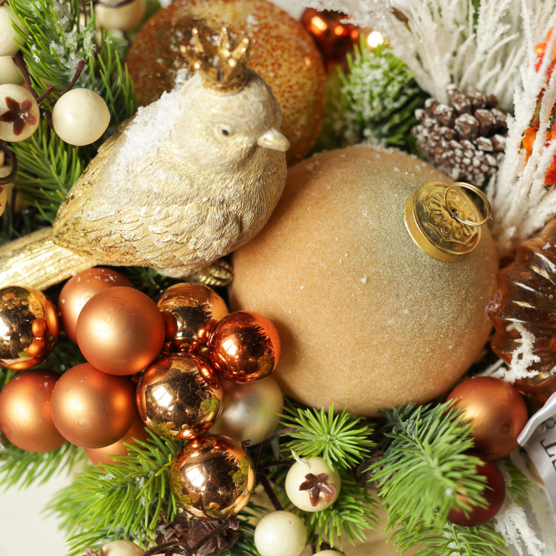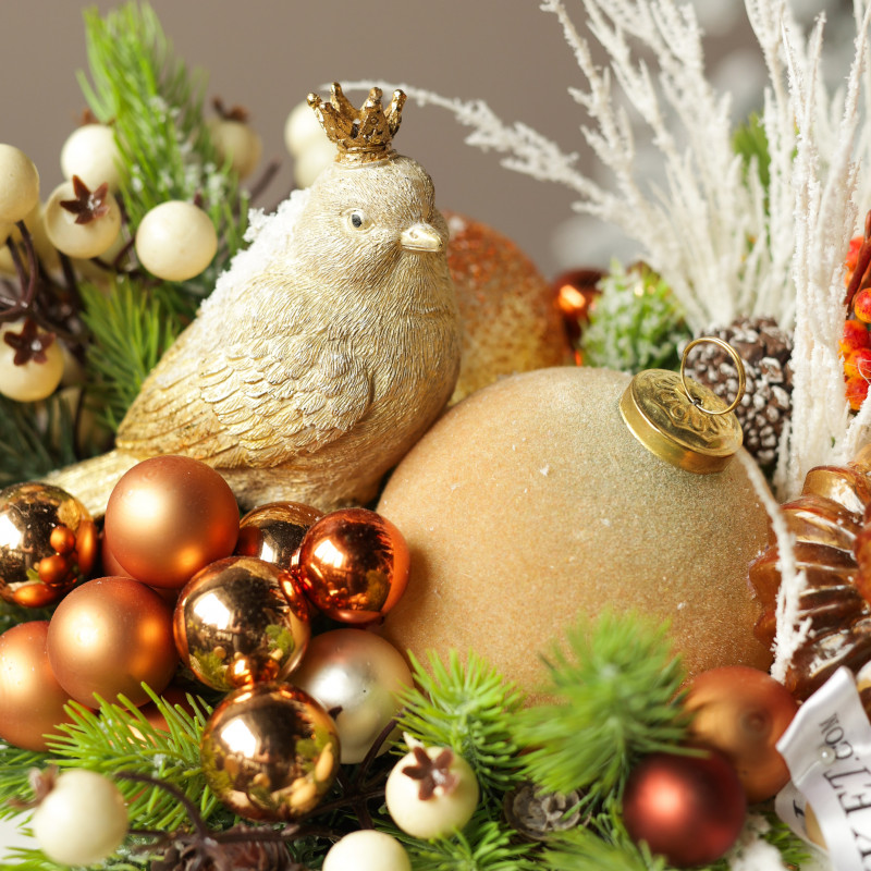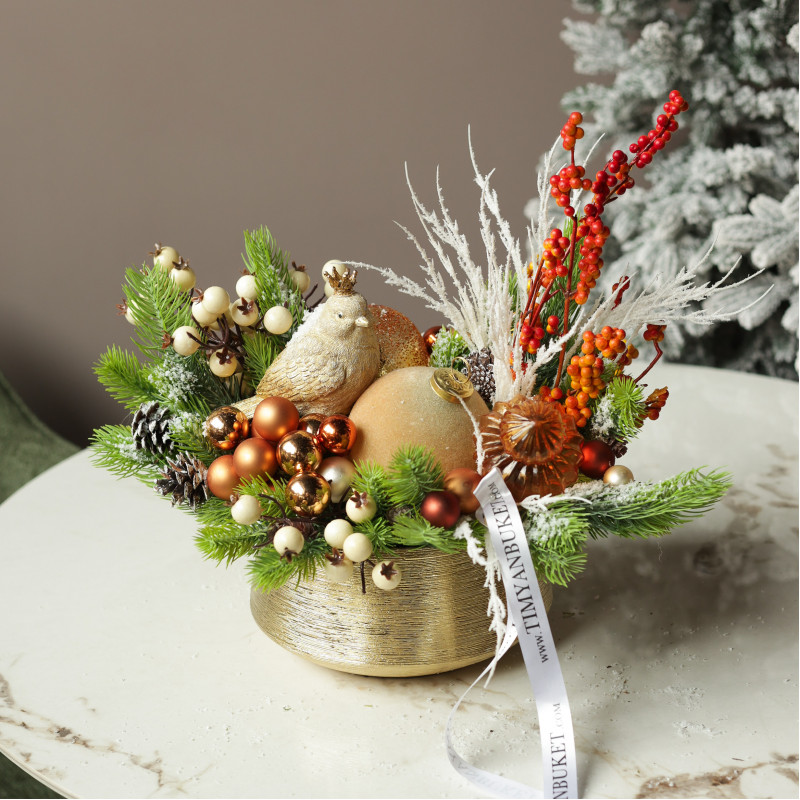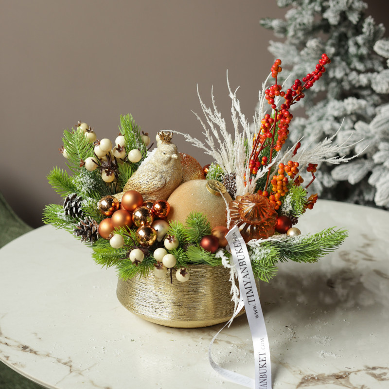 052. Новогодняя композиция в золотом кашпо с птичкой