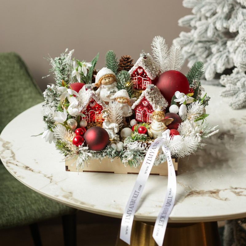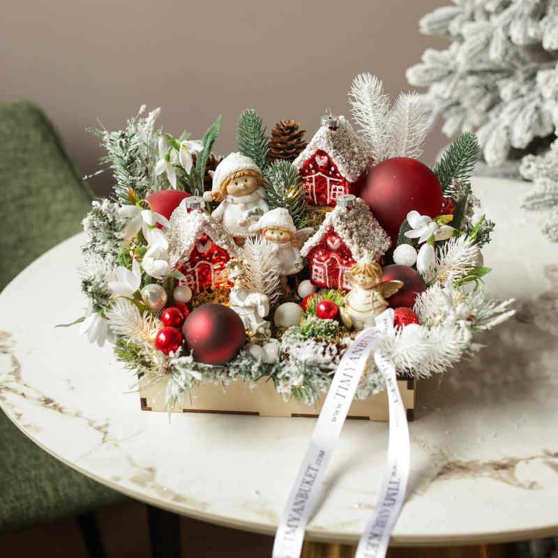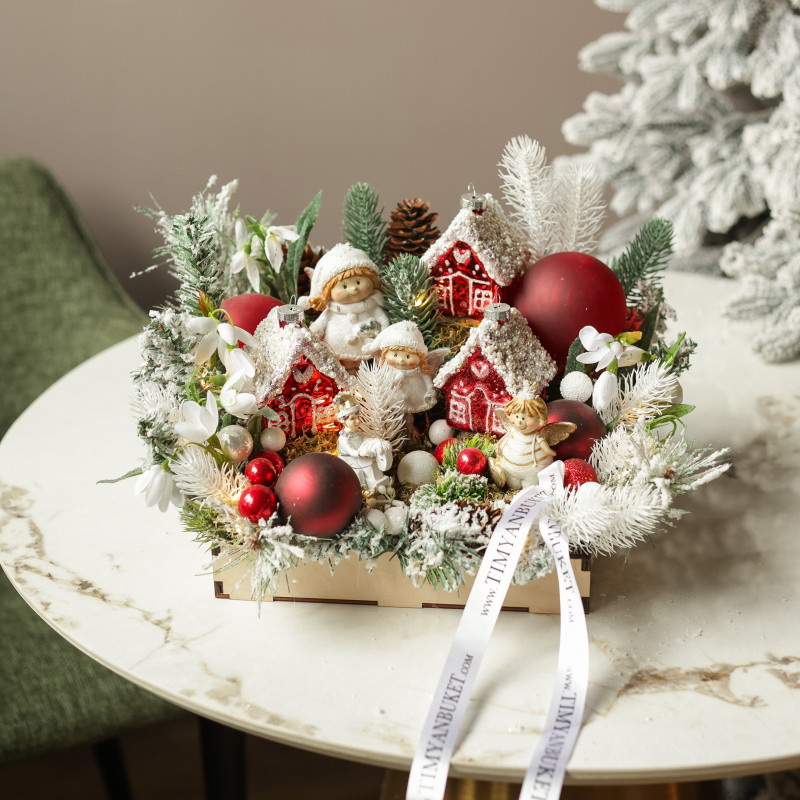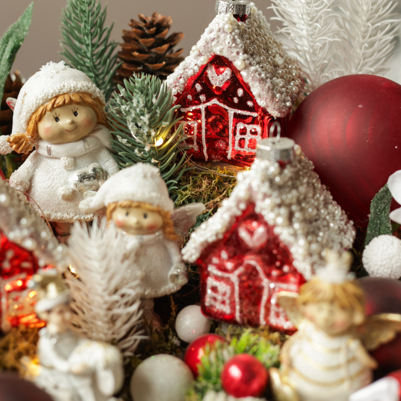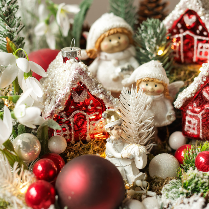 062. Новогодняя композиция с румяными эльфами и пряничными красными домиками
