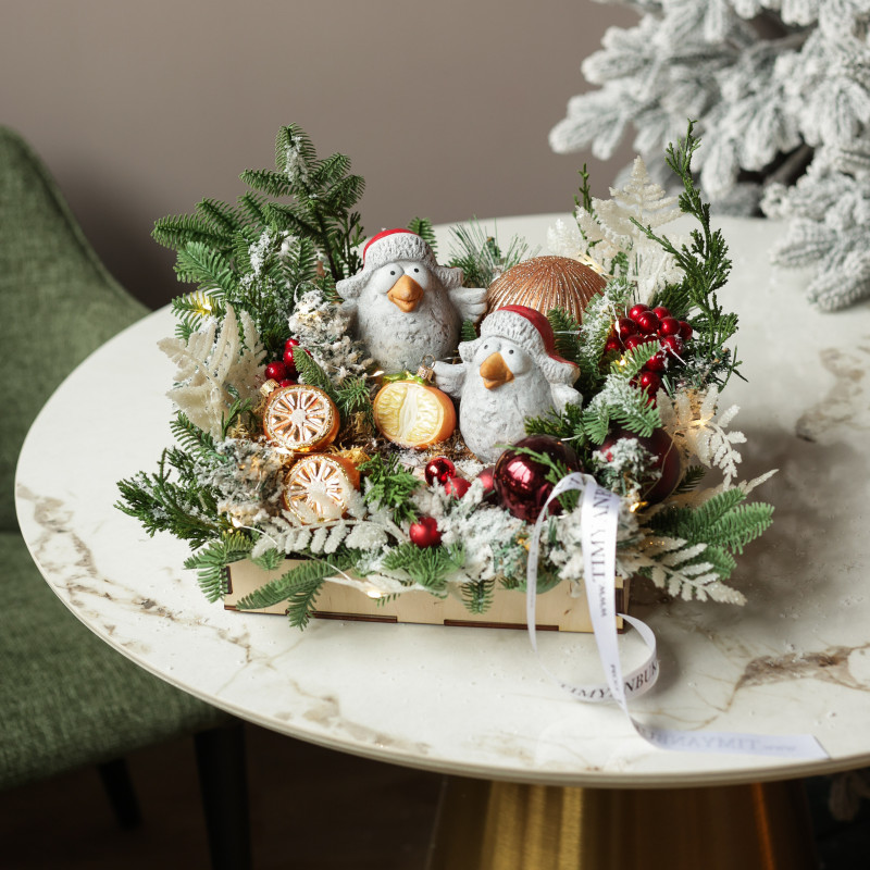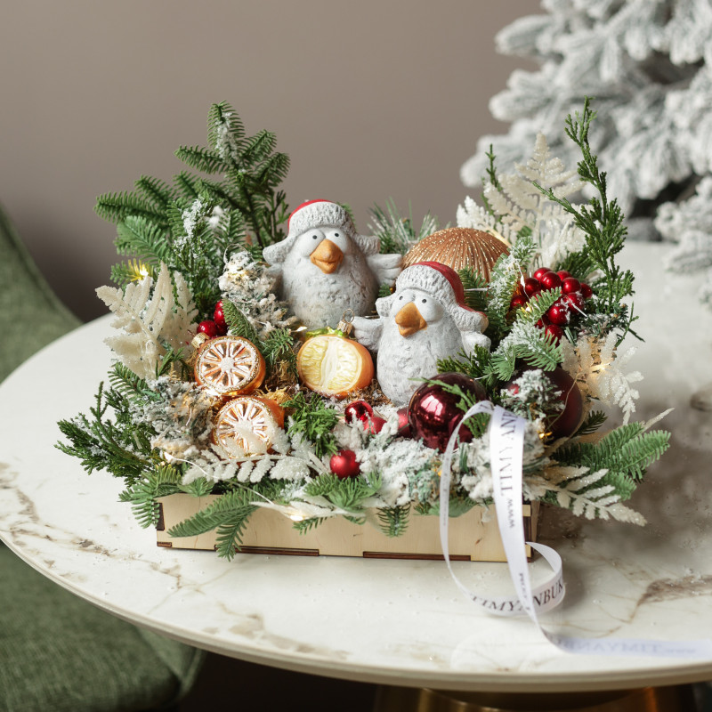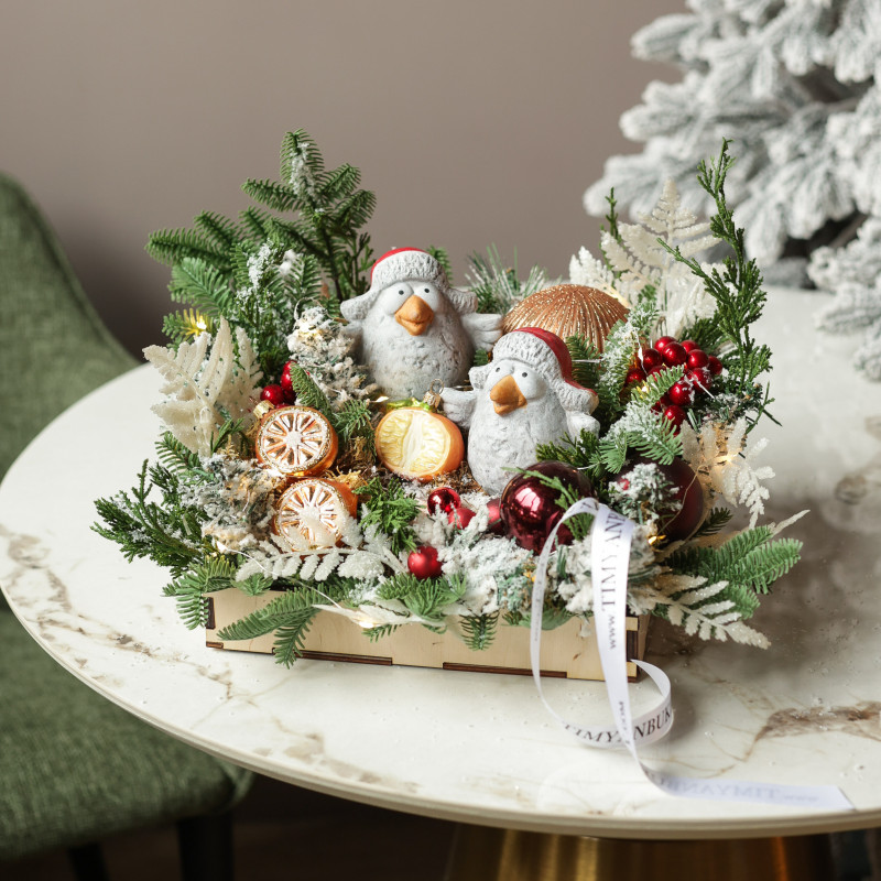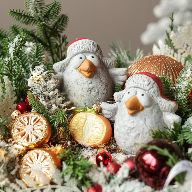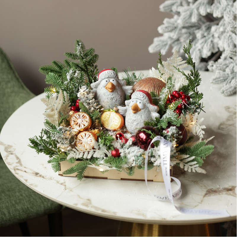 065. Новогодняя композиция с пучеглазыми птицами в шапках-ушанках