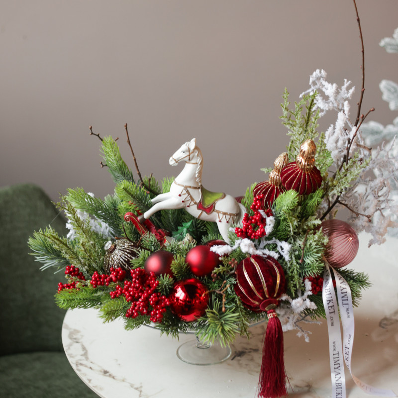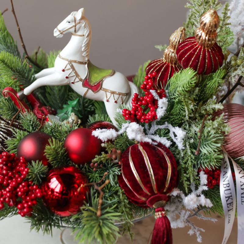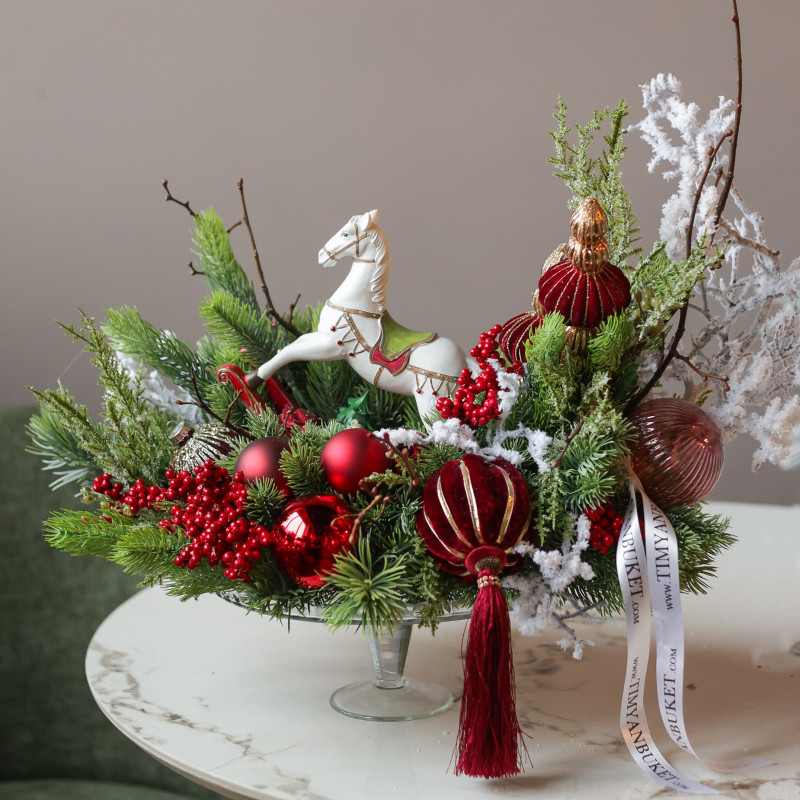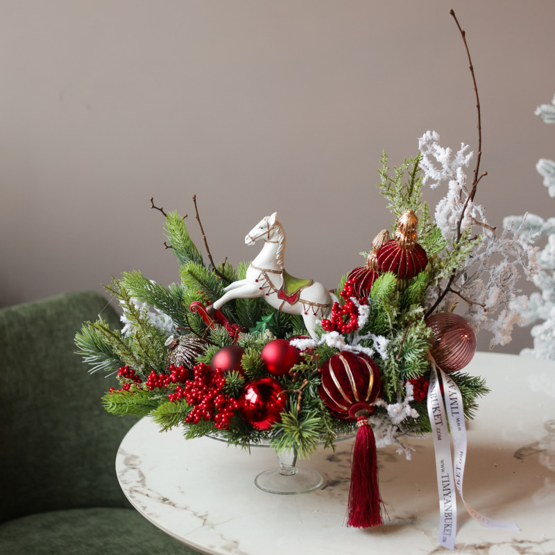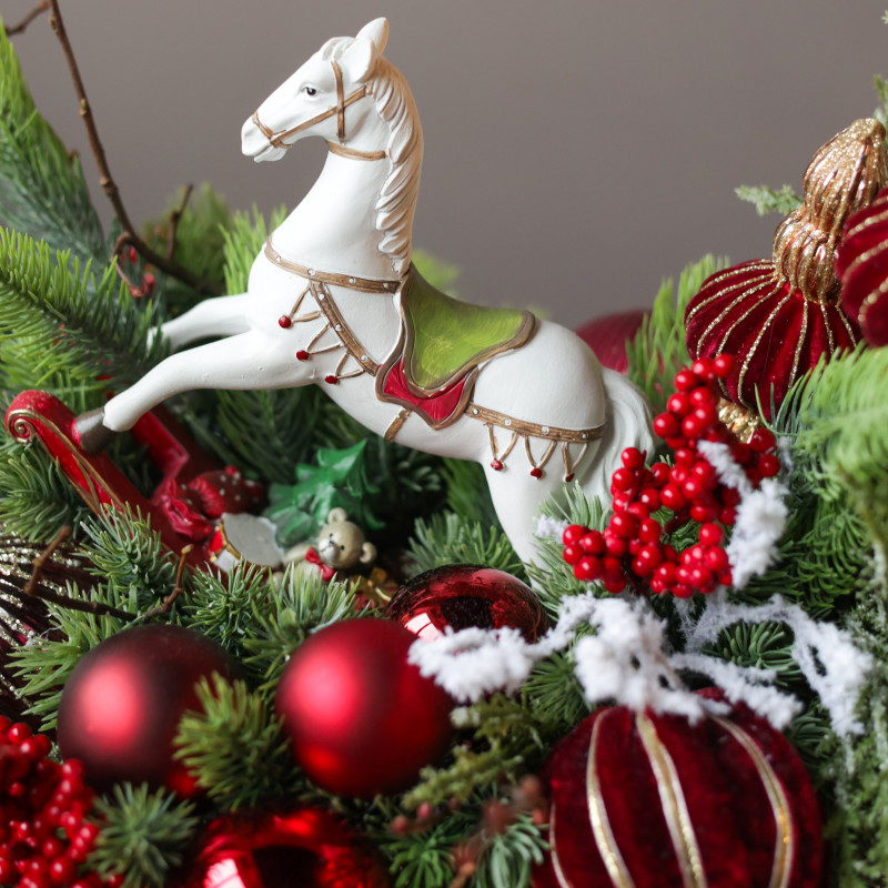 077. Новогодняя композиция на парящей подставке с красным декором и лошадкой-качалкой