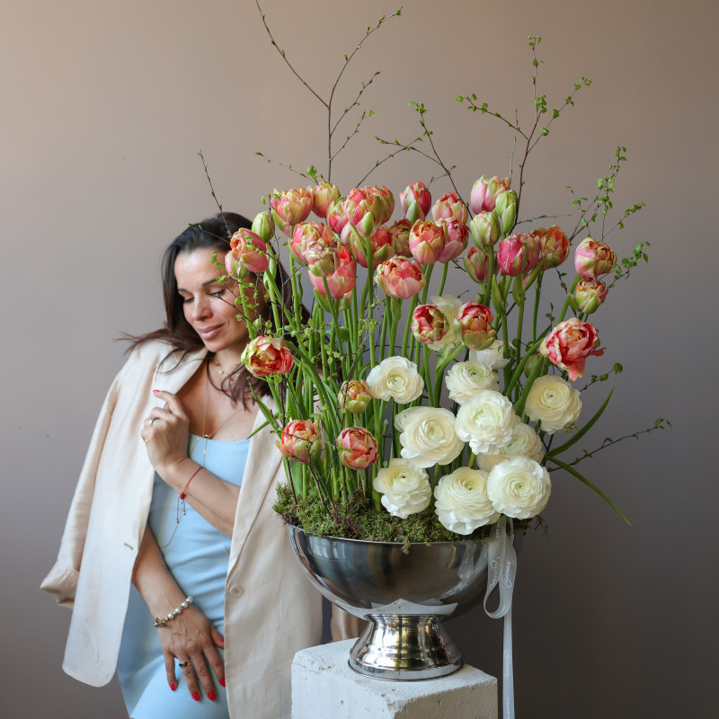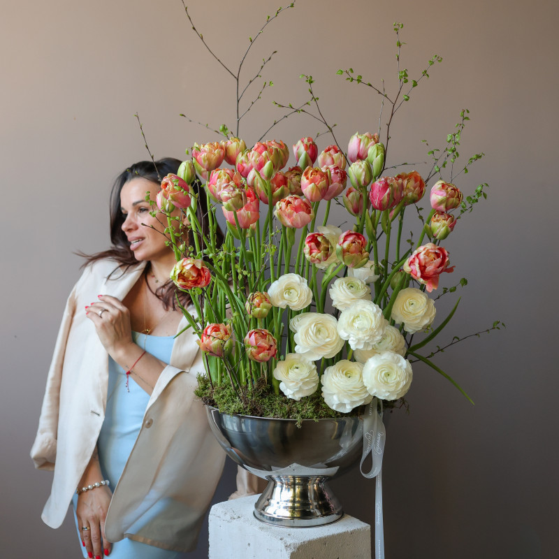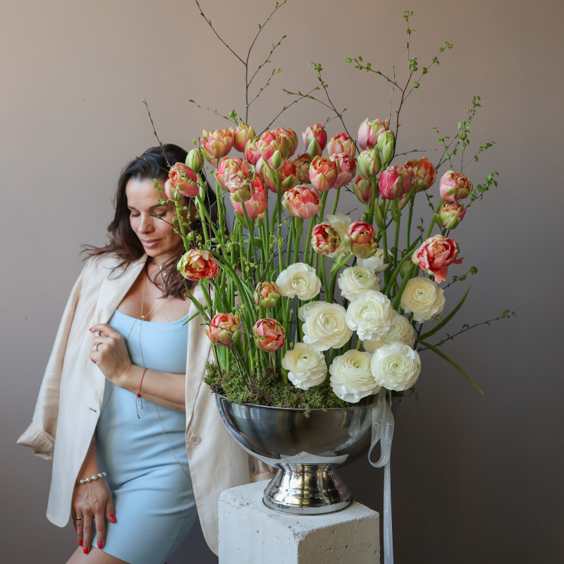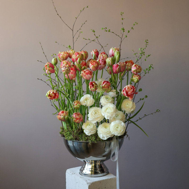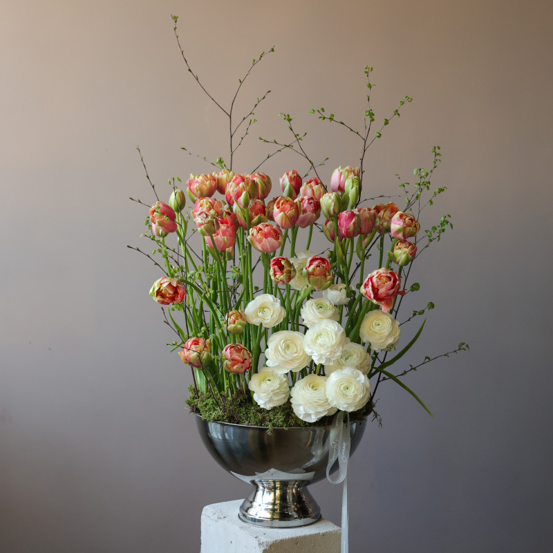 Премиум-композиция с пионовидными тюльпанами и ранункулюсами в кашпо