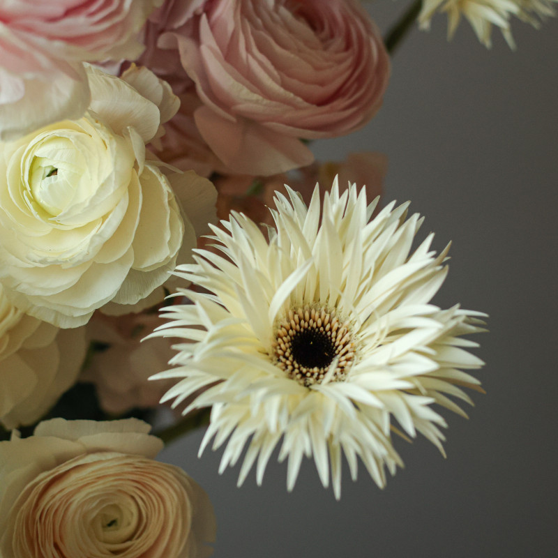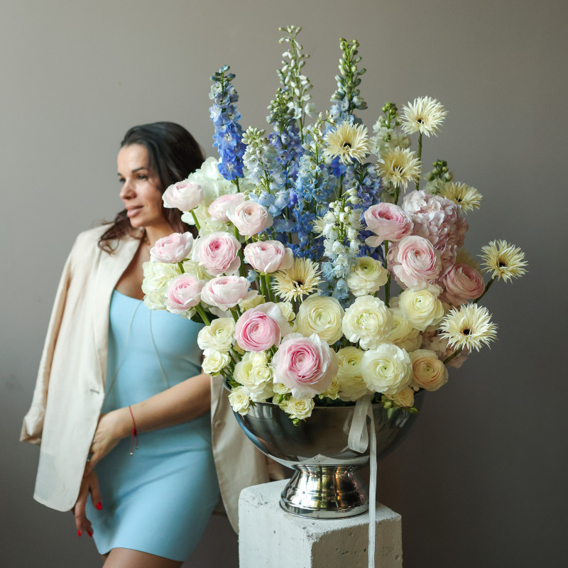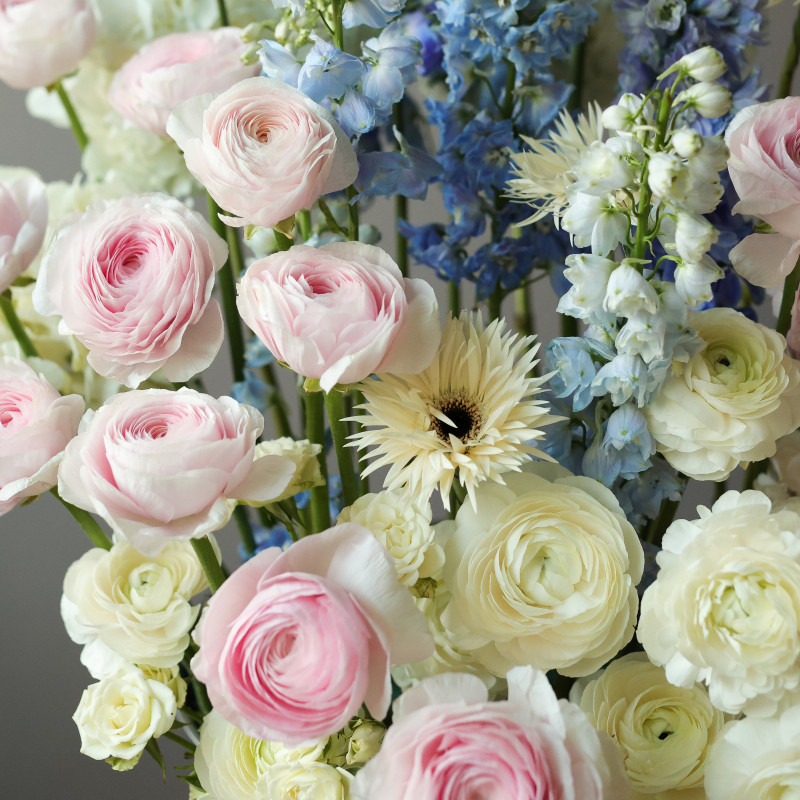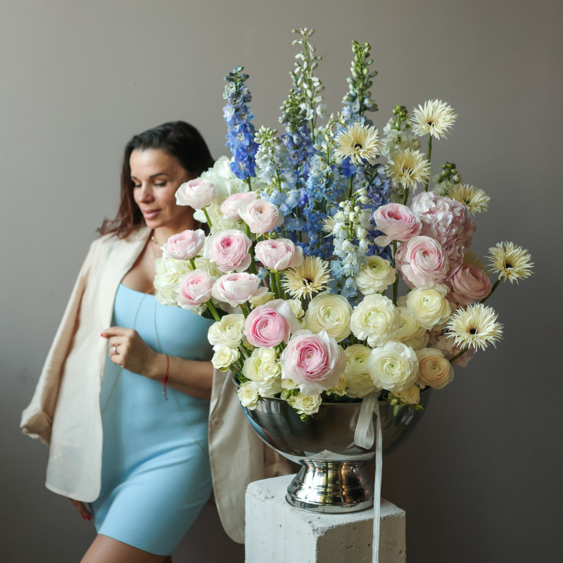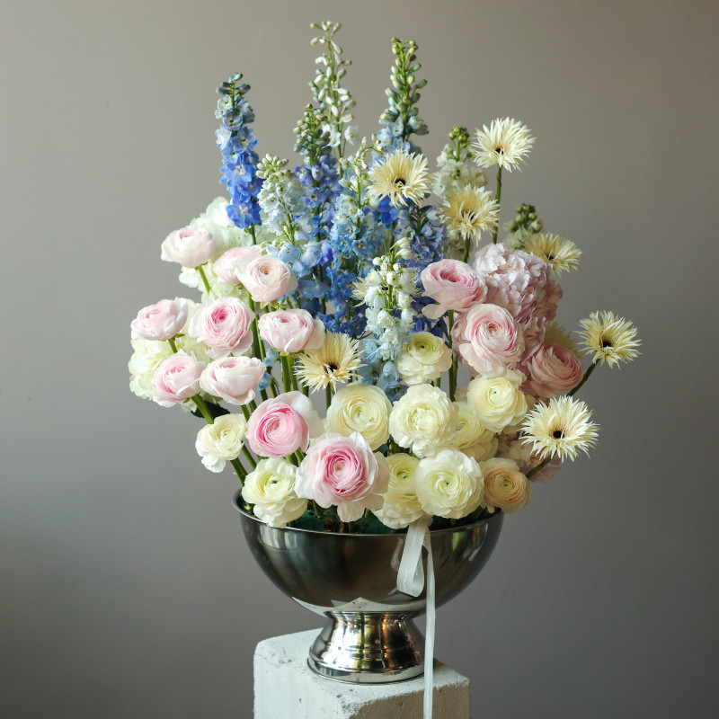 Премиум-композиция с ранункулюсами, дельфиниумом, гортензией и герберами в кашпо