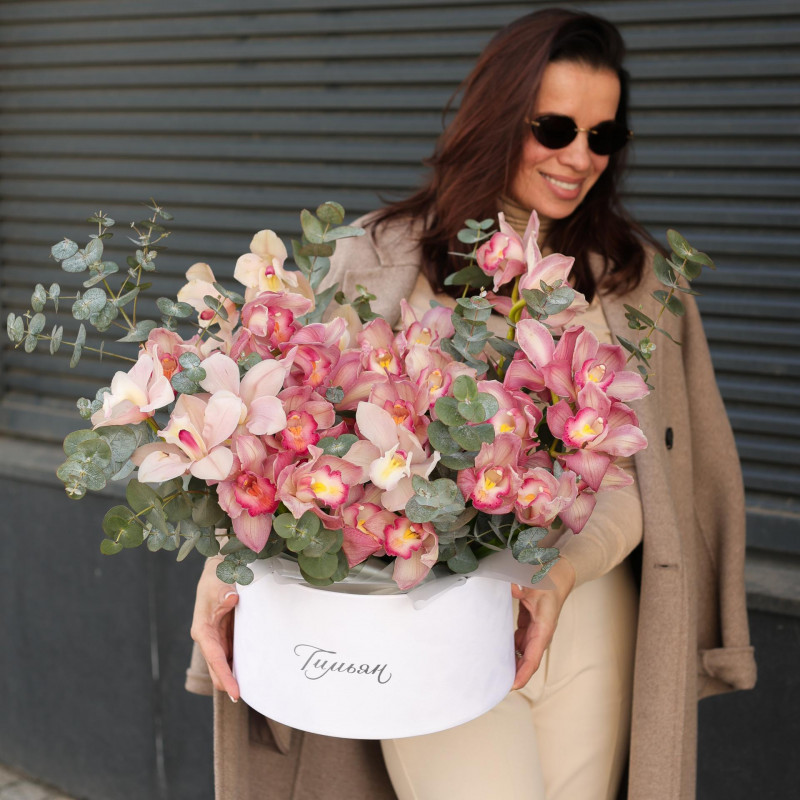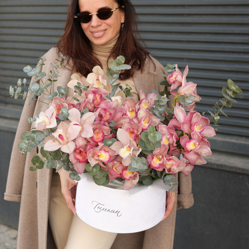 Коробка с пудровыми орхидеями и эвкалиптом
