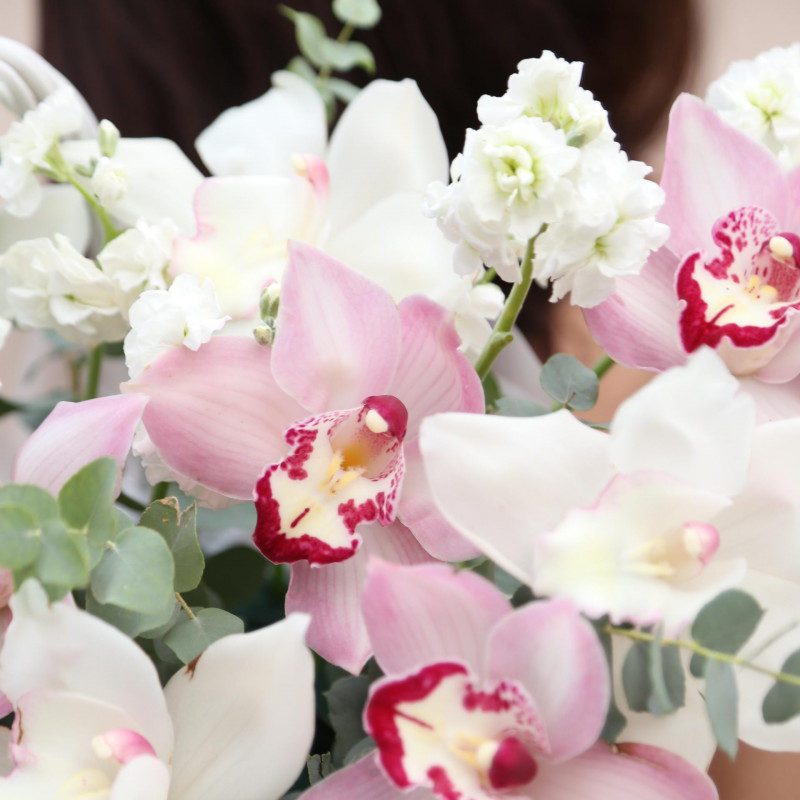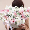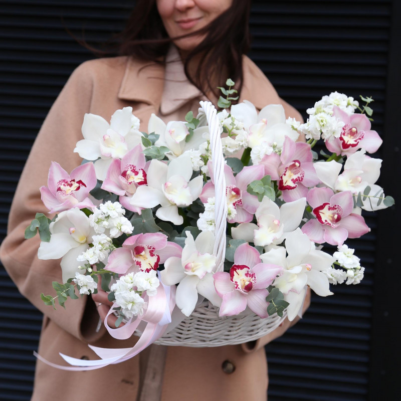 Нежная корзина с молочными и пудровыми орхидеями для ваших любимых!