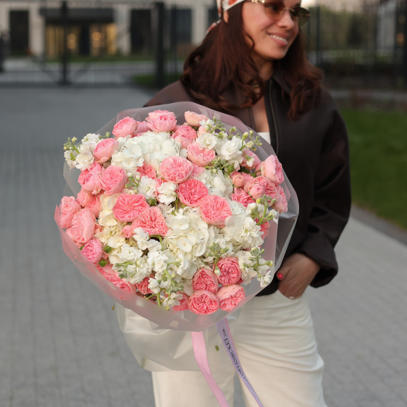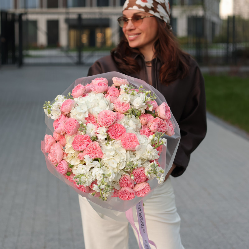 Круглый букет с пионовидными розами, маттиолой и гортензией