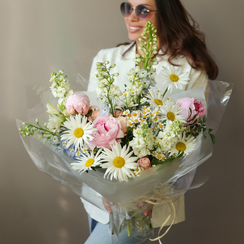 Асимметричный букет с ромашками, розовыми пионами и дельфиниумом — живой, лёгкий и по-настоящему естественный. Ромашки создают ощущение простоты и свежести, пионы добавляют мягкую романтичность и объём, а дельфиниум задаёт выразительный вертикальный акцент и глубину композиции. Альстромерия и кустовая роза дополняют букет текстурой и делают его более многослойным. Прозрачная упаковка подчёркивает природность и воздушность формы. Идеален как тёплый знак внимания или стильный подарок без повода.