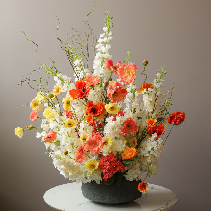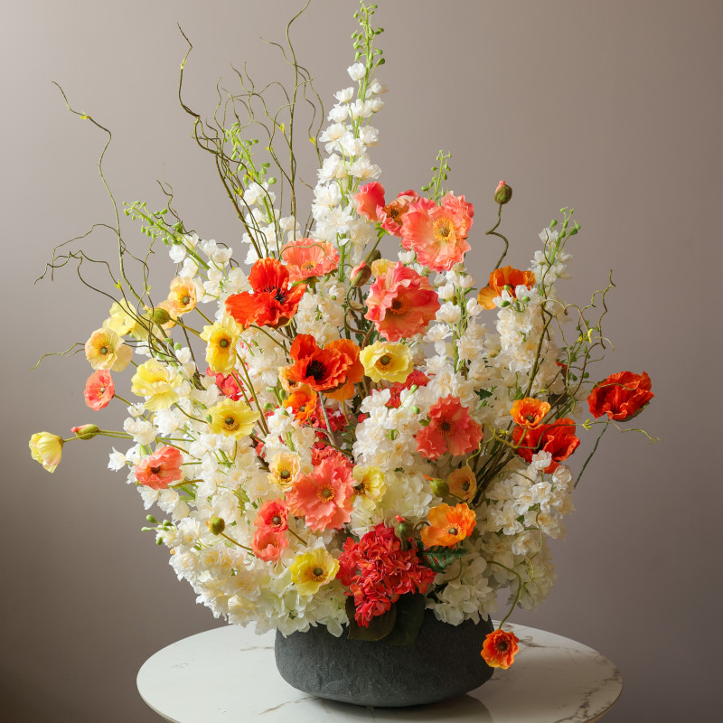 Высокая объёмная интерьерная композиция с белой маттиолой, жёлтыми и оранжево-лососевыми маками, гортензией и декоративной зеленью — выразительный акцент с характером и настроением тёплого солнечного дня. Сочетание нежности белых оттенков и ярких цветовых всплесков создаёт динамичный, но гармоничный образ. Кашпо под камень бетонного цвета подчёркивает современную эстетику и добавляет композиции стильной архитектурности.