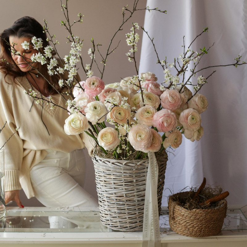 Невероятная композиция из ранункулюсов с цветущими ветками в плетеной белой корзине. Декорирована длинной лентой.