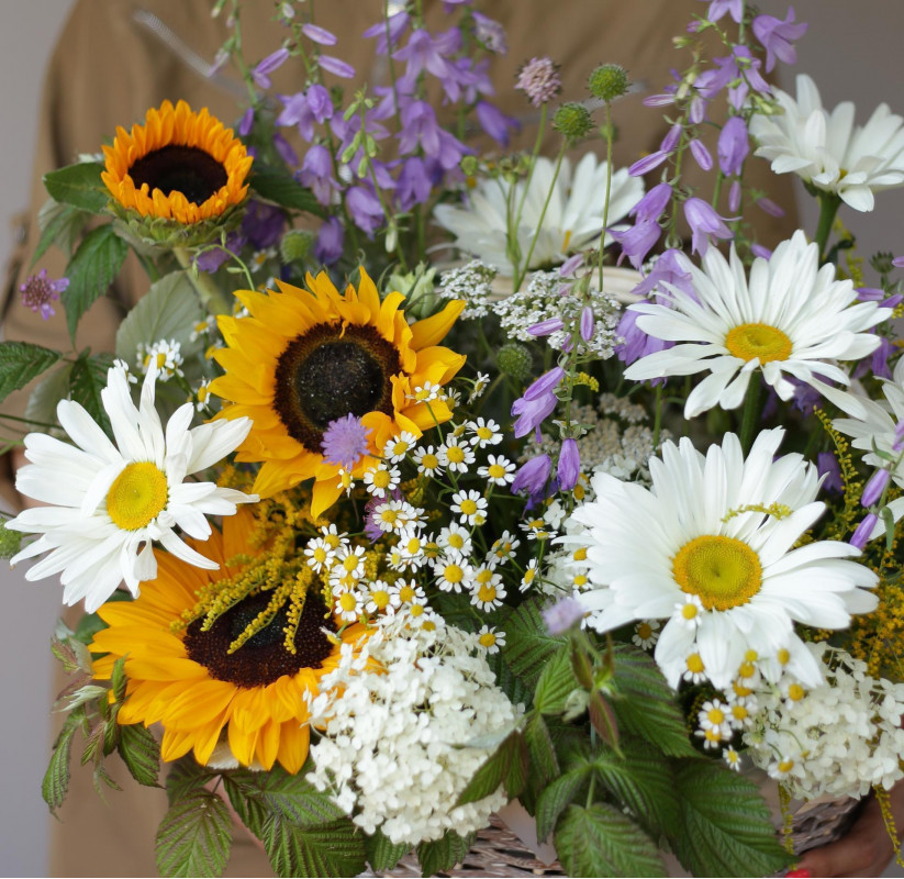 Летняя трогательная композиция с ромашками, подсолнухами и летними травами в плетеной корзинке.