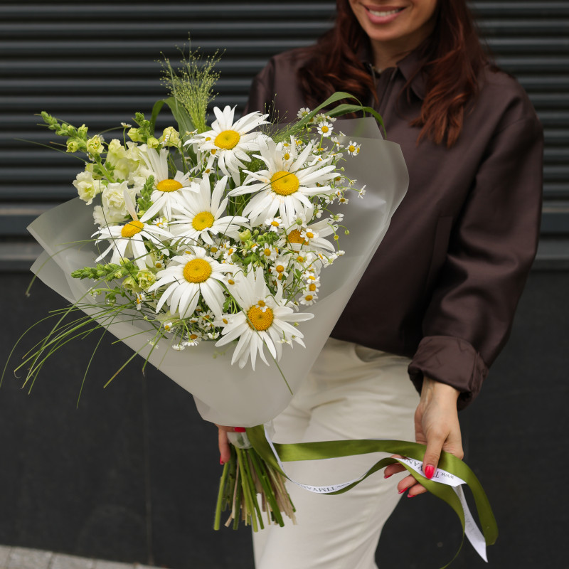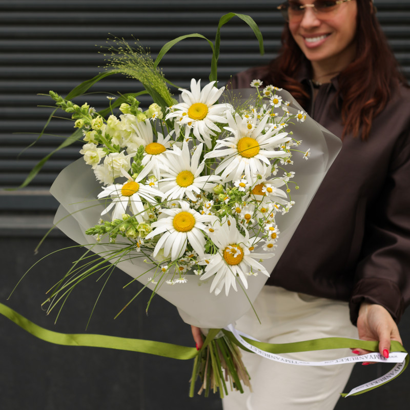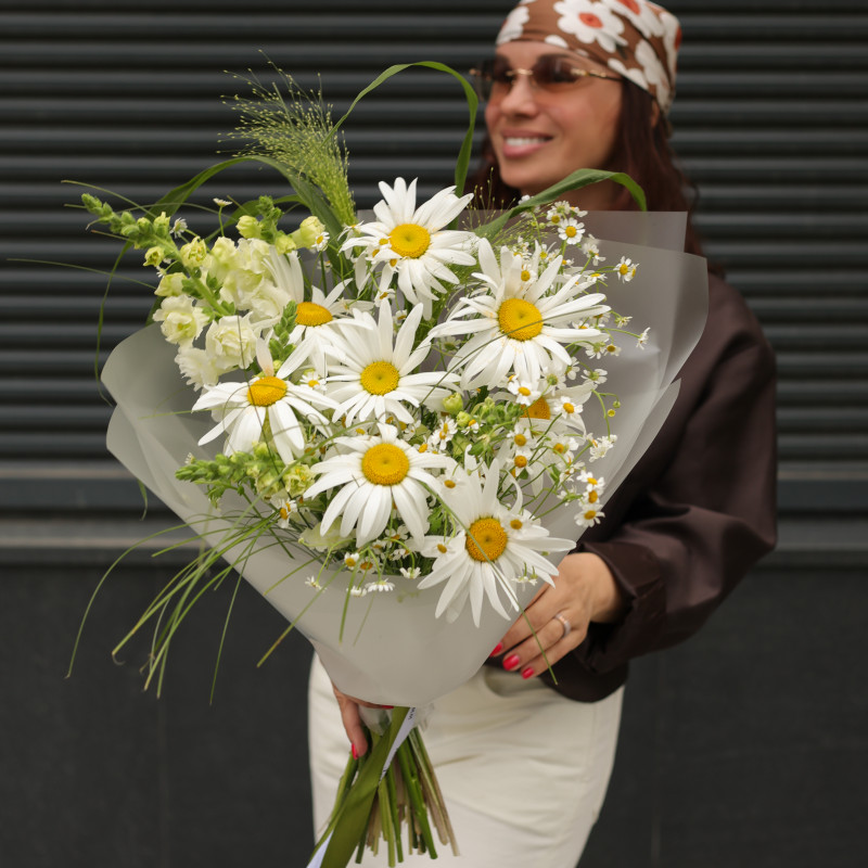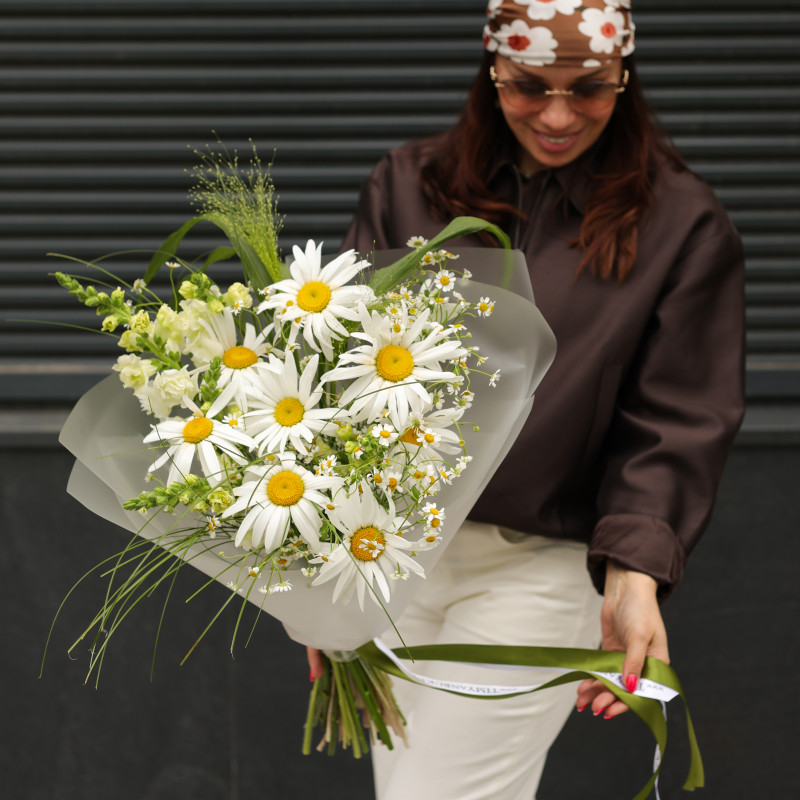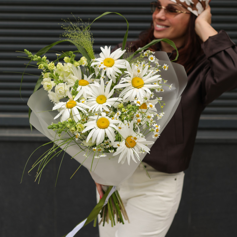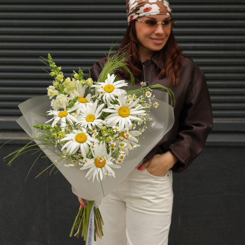 Букет с ромашками и дальфиниумом, с упаковкой