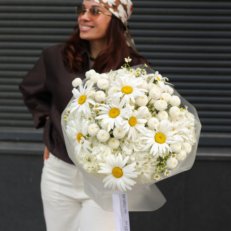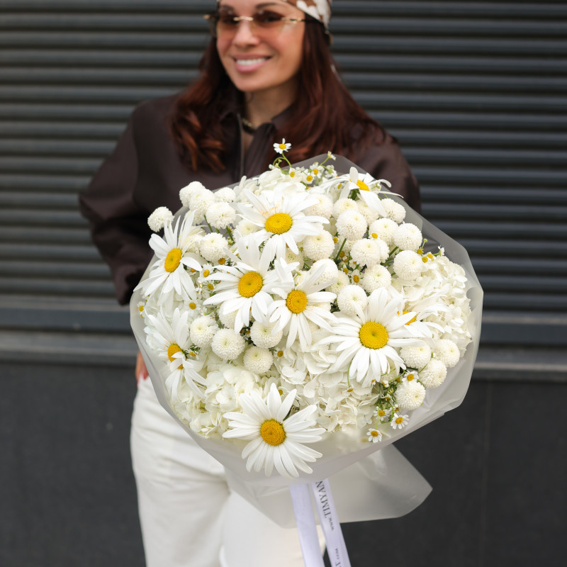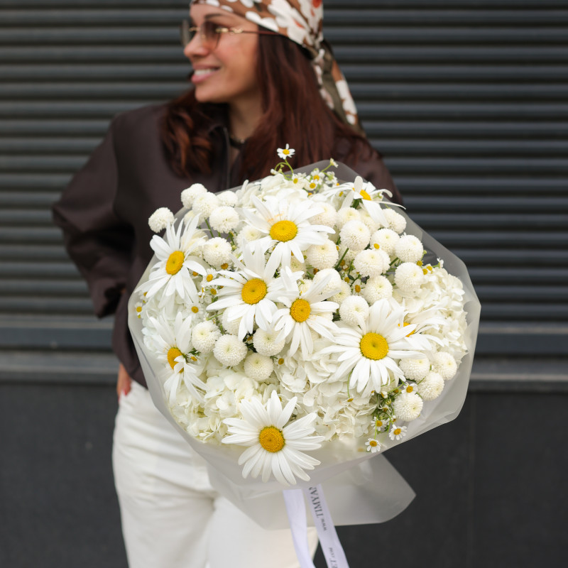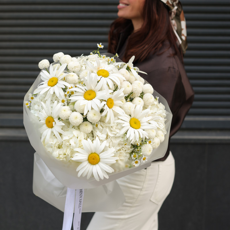 Круглый букет с ромашками и хризантемами-шариками