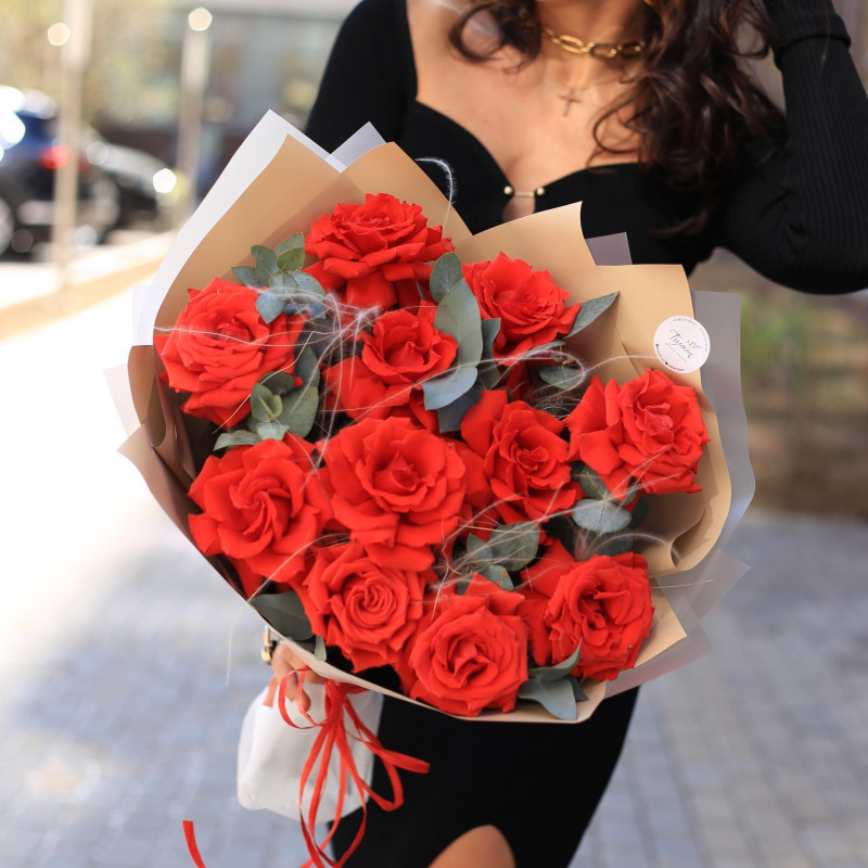 Роскошный монобукет из алых французских роз с веточками эвкалипта и стифой — это воплощение страсти и элегантности. Яркие алые розы с крупными бутонами символизируют глубокие чувства и восхищение, а веточки эвкалипта добавляют композиции свежести и изысканности. Идеальный подарок на день рождения, годовщину, романтическое свидание или свадебное торжество. Закажите этот букет с доставкой по Москве и Московской области, чтобы удивить и порадовать дорогого человека.