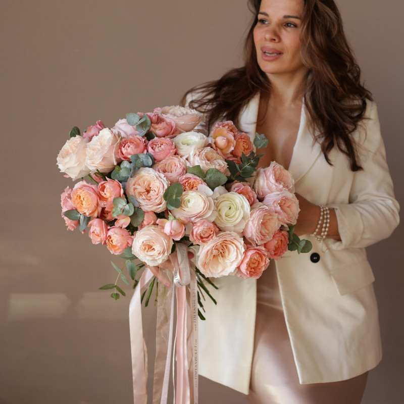 Роскошный букет цветов из элегантных пионовидных роз, ранункулюсов (либо замена на иной премиальный цветок сезона, тк ранункулюс доступен в сезон ноябрь-марта) и эвкалипта — это стильная и нежная композиция, которая подарит особую атмосферу любому празднику. Премиальные розы и ранункулюсы - Vip цветы в сочетании с зеленью эвкалипта создают гармоничный и изысканный букет, идеально подходящий для подарков на день рождения, свадьбу или юбилей. Закажите этот букет с доставкой по Москве и МО, чтобы выразить внимание и заботу.